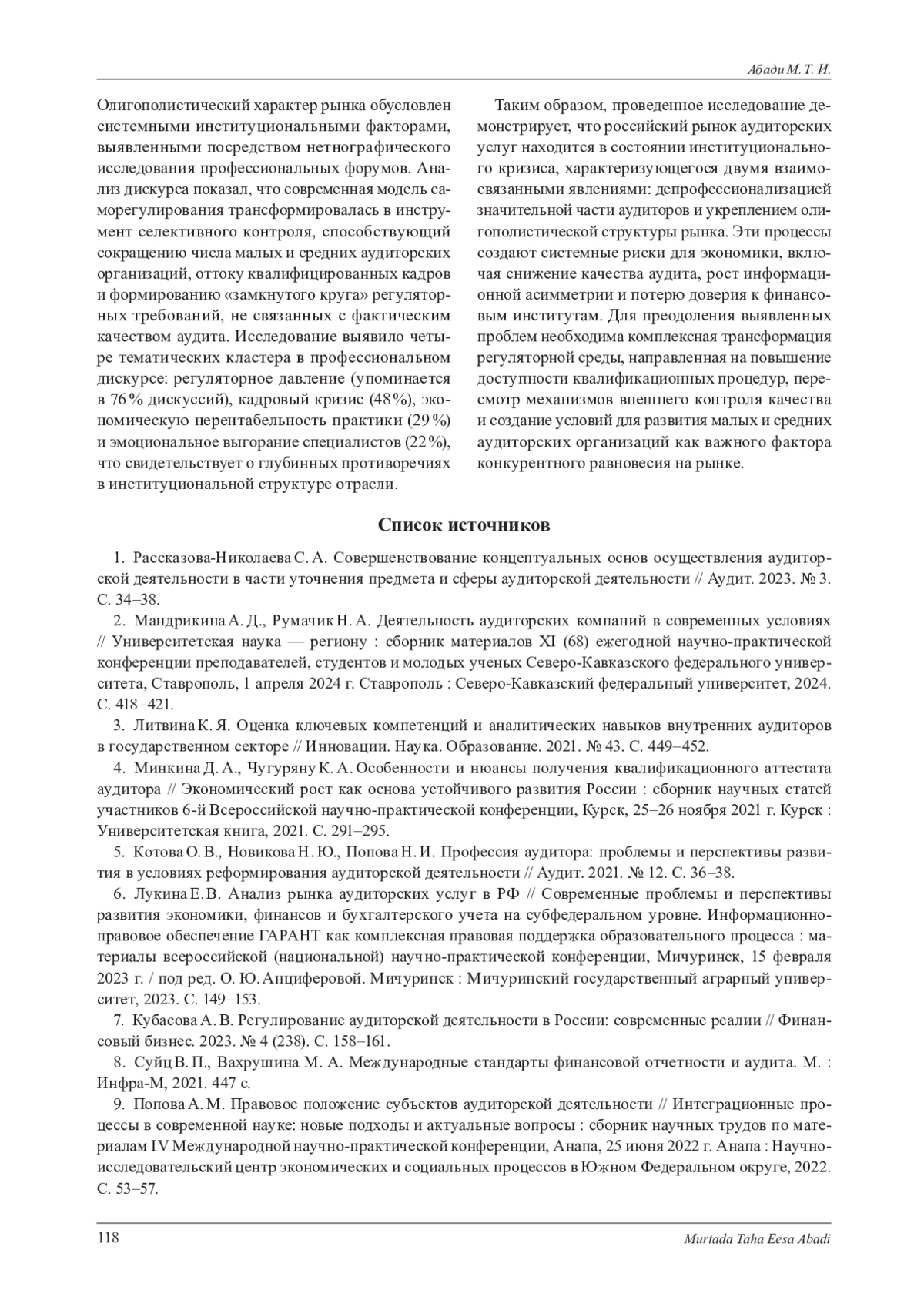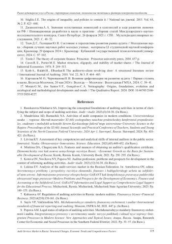 1. Рассказова-Николаева С. А. Совершенствование концептуальных основ осуществления аудиторской деятельности в части уточнения предмета и сферы аудиторской деятельности // Аудит. 2023. № 3. С. 34-38. EDN: VZAANV