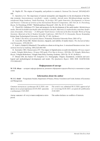 15. Kotb A., Halabi H., Elbardan H. The auditor-to-client revolving door: A structured literature review // International Journal of Auditing. 2018. Vol. 22, № 3. P. 464-485.