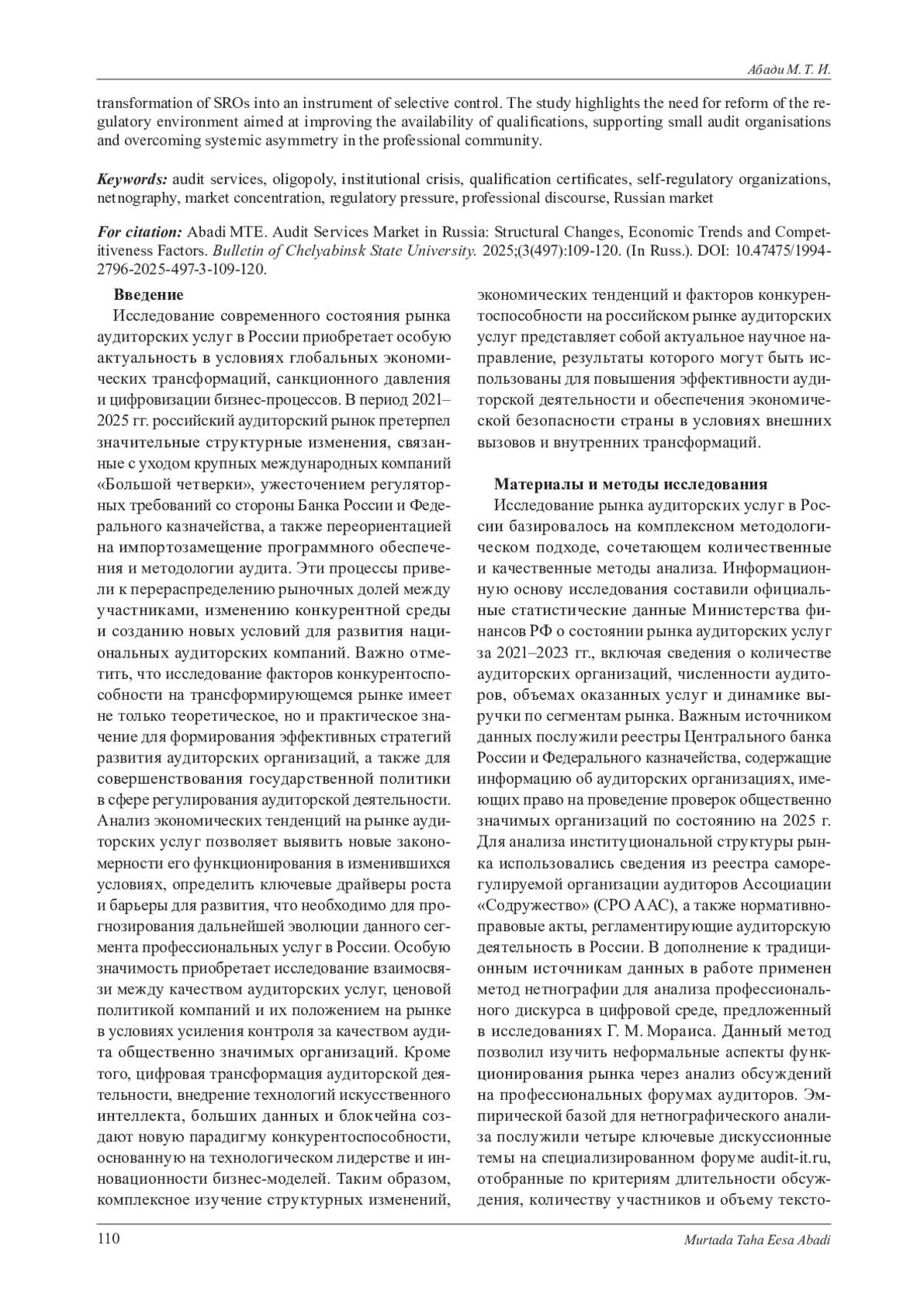 Статья посвящена анализу структурных и институциональных проблем российского рынка аудиторских услуг в период 2021-2025 гг., включая последствия ухода международных компаний «Большой четверки» и усиления регуляторного контроля. На основе комплексного подхода, сочетающего количественные методы (структурно-динамический анализ, расчет коэффициентов концентрации CR3 и индекса Херфиндаля - Хиршмана) и нетнографическое исследование профессионального дискурса на форуме audit-it. ru, выявлены ключевые вызовы отрасли. Результаты демонстрируют критическую депрофессионализацию: только 29,5 % аудиторов обладают единым квалификационным аттестатом, что усугубляет риски качества аудита. Олигополистическая структура рынка, где 2 % организаций контролируют 67,5 % объема услуг, обусловлена институциональными факторами, включая дисфункцию саморегулируемых организаций (СРО). Нетнографический анализ дискуссий выявил четыре доминирующих темы: регуляторное давление (76 %), кадровый кризис (48 %), финансовая нерентабельность (29 %) и эмоциональное выгорание (22 %), подтверждая трансформацию СРО в инструмент селективного контроля. Исследование подчеркивает необходимость реформы регуляторной среды, направленной на повышение доступности квалификации, поддержку малых аудиторских организаций и преодоление системной асимметрии в профессиональном сообществе.