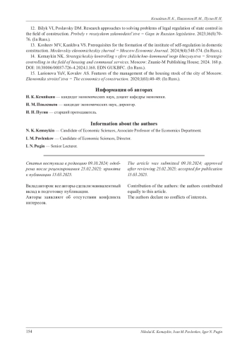 13. Кощеев М. В., Канхва В. С. Предпосылки формирования института саморегулирования в отечественном строительстве // Московский экономический журнал. 2024. Т. 9, № 4. С. 548-574. EDN: LHLOIC