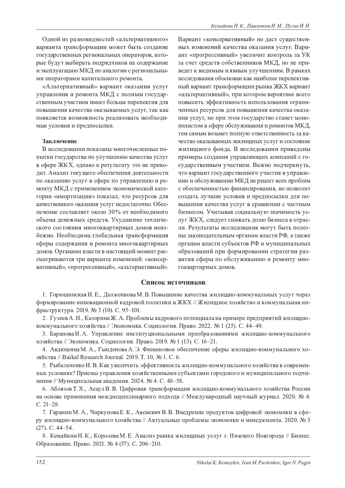 1. Горюшинская И. Е., Долженкова М. В. Повышение качества жилищно-коммунальных услуг через формирование инновационной кадровой политики в ЖКХ // Жилищное хозяйство и коммунальная инфраструктура. 2019. № 3 (10). С. 95-101. EDN: VTTSLP