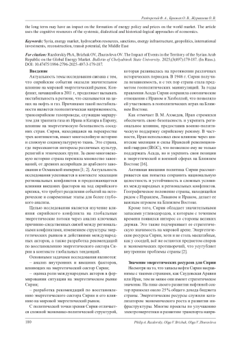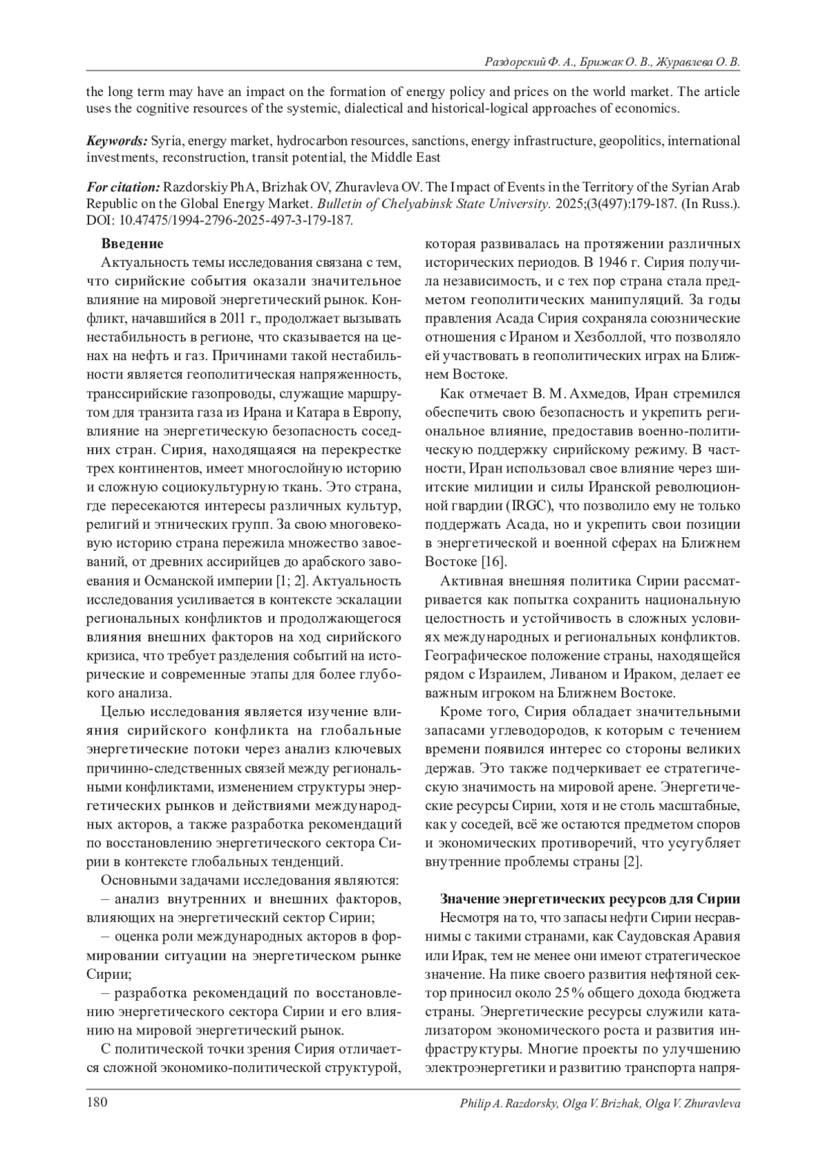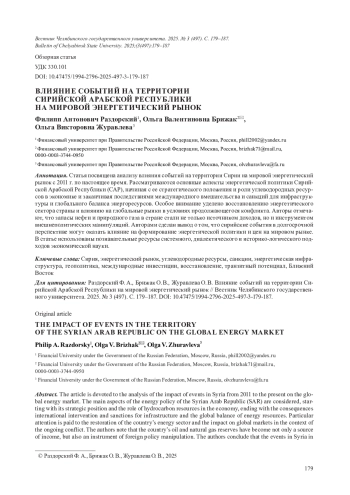 Статья посвящена анализу влияния событий на территории Сирии на мировой энергетический рынок с 2011 г. по настоящее время. Рассматриваются основные аспекты энергетической политики Сирийской Арабской Республики (САР), начиная с ее стратегического положения и роли углеводородных ресурсов в экономике и заканчивая последствиями международного вмешательства и санкций для инфраструктуры и глобального баланса энергоресурсов. Особое внимание уделено восстановлению энергетического сектора страны и влиянию на глобальные рынки в условиях продолжающегося конфликта. Авторы отмечают, что запасы нефти и природного газа в стране стали не только источником доходов, но и инструментом внешнеполитических манипуляций. Авторами сделан вывод о том, что сирийские события в долгосрочной перспективе могут оказать влияние на формирование энергетической политики и цен на мировом рынке. В статье использованы познавательные ресурсы системного, диалектического и историко- логического подходов экономической науки.