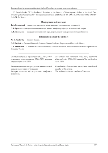 17. Антощенко Д. В. Сирийско- израильские отношения в контексте современных кризисов на араб ском Востоке // Социально- политические науки. 2024. Т. 14, № 2. С. 45-54. 10.33693/2223-0092 2024-14-2-45-54. DOI: 10.33693/2223-00922024-14-2-45-54 EDN: GPKUIW