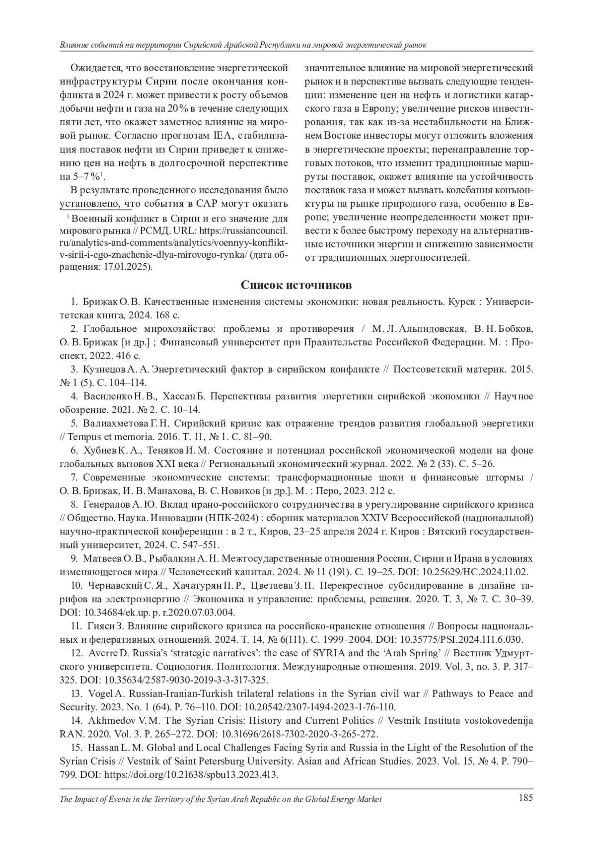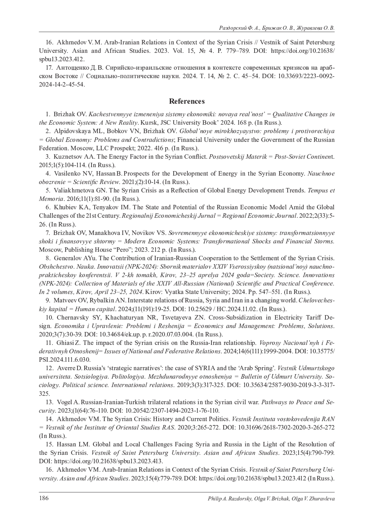 15. Hassan L. M. Global and Local Challenges Facing Syria and Russia in the Light of the Resolution of the Syrian Crisis // Vestnik of Saint Petersburg University. Asian and African Studies. 2023. Vol. 15, № 4. P. 790 799. 10.21638/spbu13.2023.413. 185. DOI: 10.21638/spbu13.2023.413.185