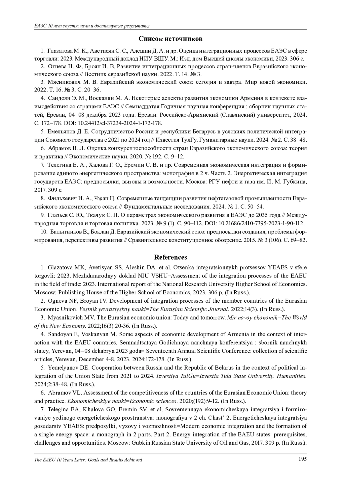 1. Глазатова М. К., Аветисян С. С., Алешин Д. А. и др. Оценка интеграционных процессов ЕАЭС в сфере торговли: 2023. Международный доклад НИУ ВШУ. М.: Изд. дом Высшей школы экономики, 2023. 306 с.