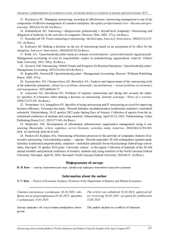 20. Karamyshev A. N., Cherepovitsyn A. E., Berezikov S. A. Analysis and improvement of the outsourcing tools at the industrial enterprises // Актуальные проблемы экономики и менеджмента. 2023. No. 4 (40). P. 66-77. EDN: WDVYRY