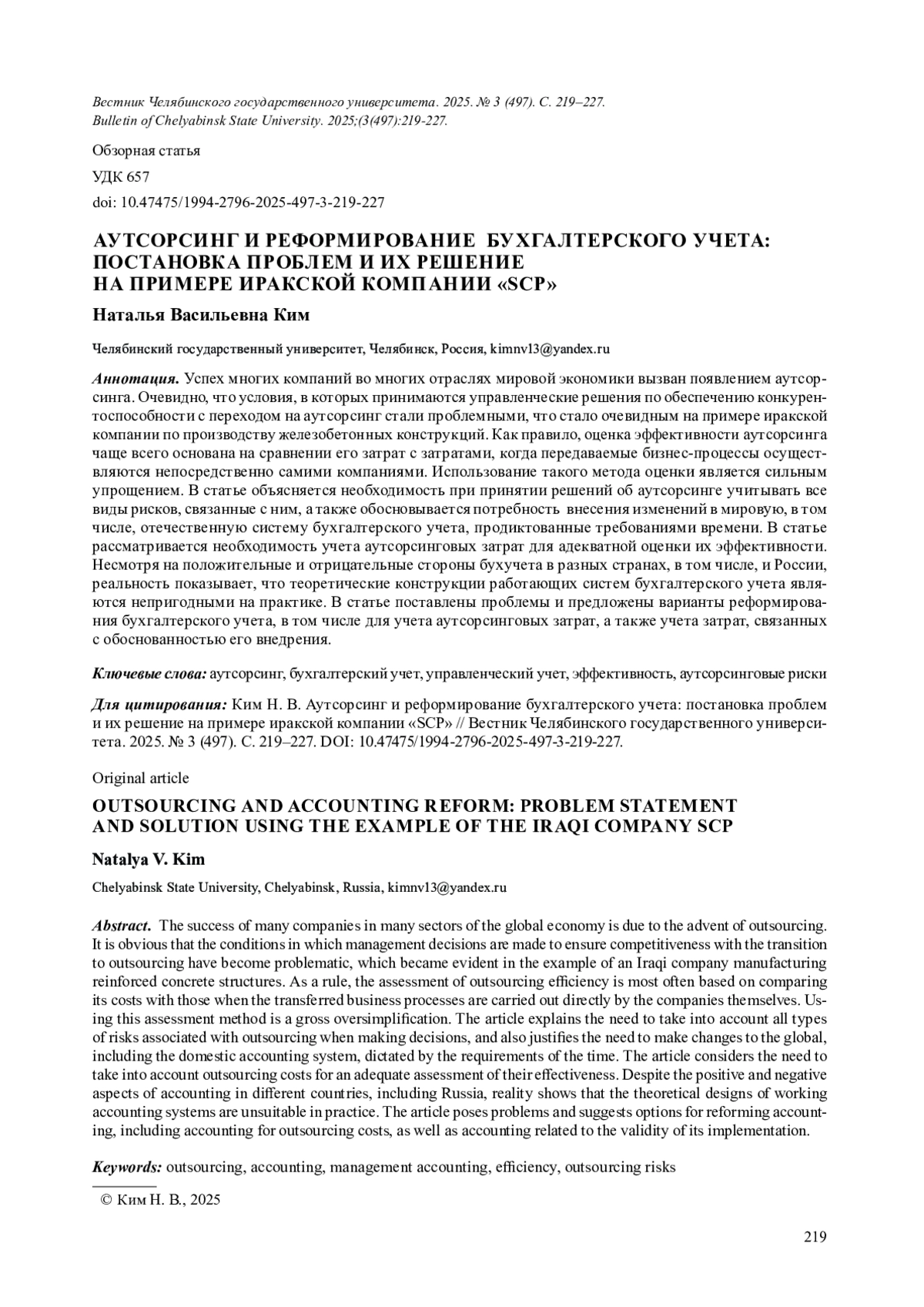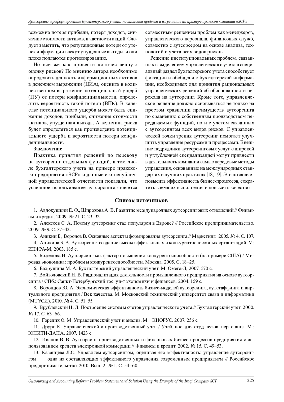 Успех многих компаний во многих отраслях мировой экономики вызван появлением аутсорсинга. Очевидно, что условия, в которых принимаются управленческие решения по обеспечению конкурентоспособности с переходом на аутсорсинг стали проблемными, что стало очевидным на примере иракской компании по производству железобетонных конструкций. Как правило, оценка эффективности аутсорсинга чаще всего основана на сравнении его затрат с затратами, когда передаваемые бизнес-процессы осуществляются непосредственно самими компаниями. Использование такого метода оценки является сильным упрощением. В статье объясняется необходимость при принятии решений об аутсорсинге учитывать все виды рисков, связанные с ним, а также обосновывается потребность внесения изменений в мировую, в том числе, отечественную систему бухгалтерского учета, продиктованные требованиями времени. В статье рассматривается необходимость учета аутсорсинговых затрат для адекватной оценки их эффективности. Несмотря на положительные и отрицательные стороны бухучета в разных странах, в том числе, и России, реальность показывает, что теоретические конструкции работающих систем бухгалтерского учета являются непригодными на практике. В статье поставлены проблемы и предложены варианты реформирования бухгалтерского учета, в том числе для учета аутсорсинговых затрат, а также учета затрат, связанных с обоснованностью его внедрения.