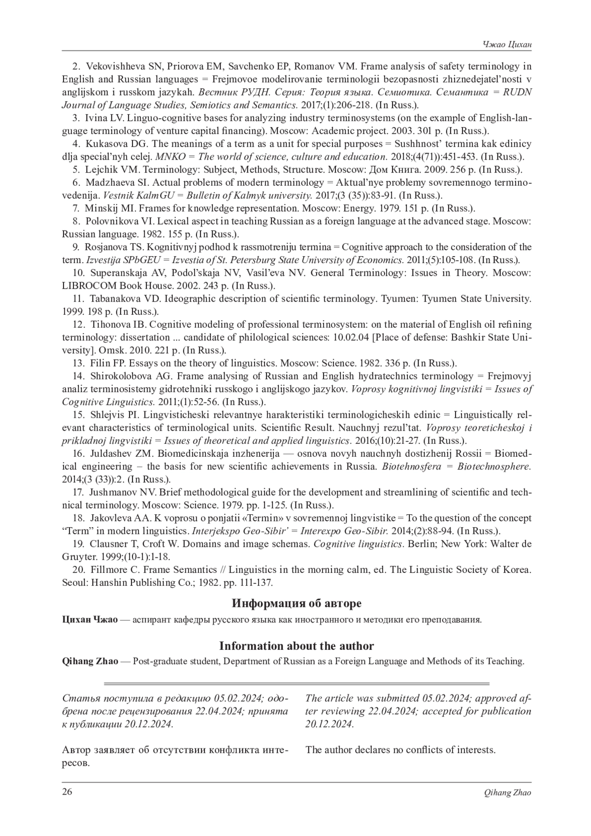 2. Вековищева С. Н., Приорова Е. М., Савченко Е. П., Романов В. М. Фреймовое моделирование терминологии безопасности жизнедеятельности в английском и русском языках // Вестник РУДН. Серия: Теория языка. Семиотика. Семантика. 2017. № 1. С. 206-218. EDN: YFUBUJ