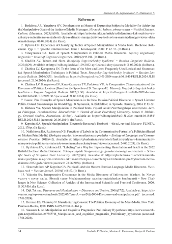 3. Виноградова С. А. Инструменты речевой манипуляции в политическом медиадискурсе // Вопросы когнитивной лингвистики. 2010. № 2. С. 95-101. EDN: MVDFOT