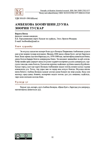 Эн өгүллд хальмгин келмрч болн дууч Боовуш Пюрвеевна Амбековин үлдәсн амн үгин зөөрин тускар келгдҗәнә. Икнкнь 2006 җилд «Цецн булг» дегтрт барлгдсн билә. Болв зәрмнь ода чигн барлгдад уга, 1970-1980 җҗ. магнитофонд шиӊгәгдсн бәәнә, дәкәд болхла һарарн бичгсн девтрмүднь бәәнә. Эн көлдмшт шинҗлһнә эв-арһ олзгдв. Хойр миӊһн арвн дөрвдгч җилд өгүллин түүрвәч келмрчин үлдәсн девтрмүдлә, зургудла таньлдв, өмнь болхла, Хальмгин күрәлӊд хадһлҗах дууһинь цааснд буулһсмн. Һундл төрхд, өдгә цаг күртл Боовуш Амбековин медсн тоотнь номин халхас гүүнәр шинҗлгдәд уга. Тегәд, тер учрас авн эн төрәр иим өглүлл бичгдв. Өгүллин аштнь иигҗ бичәтә: Амбека Боовуш хальмг улстан үнлҗ болшго ик зөөр үлдәҗ. Кедү олн җилмүд орад-давад йоввчн, келмрчин медсн тоотнь үкл уга мөңкинд хадһлгдх, эврә келн-әмтндән келгдҗ йовх.