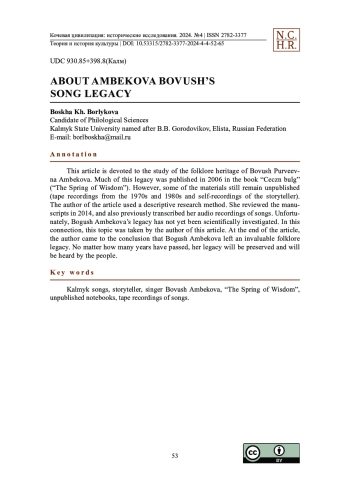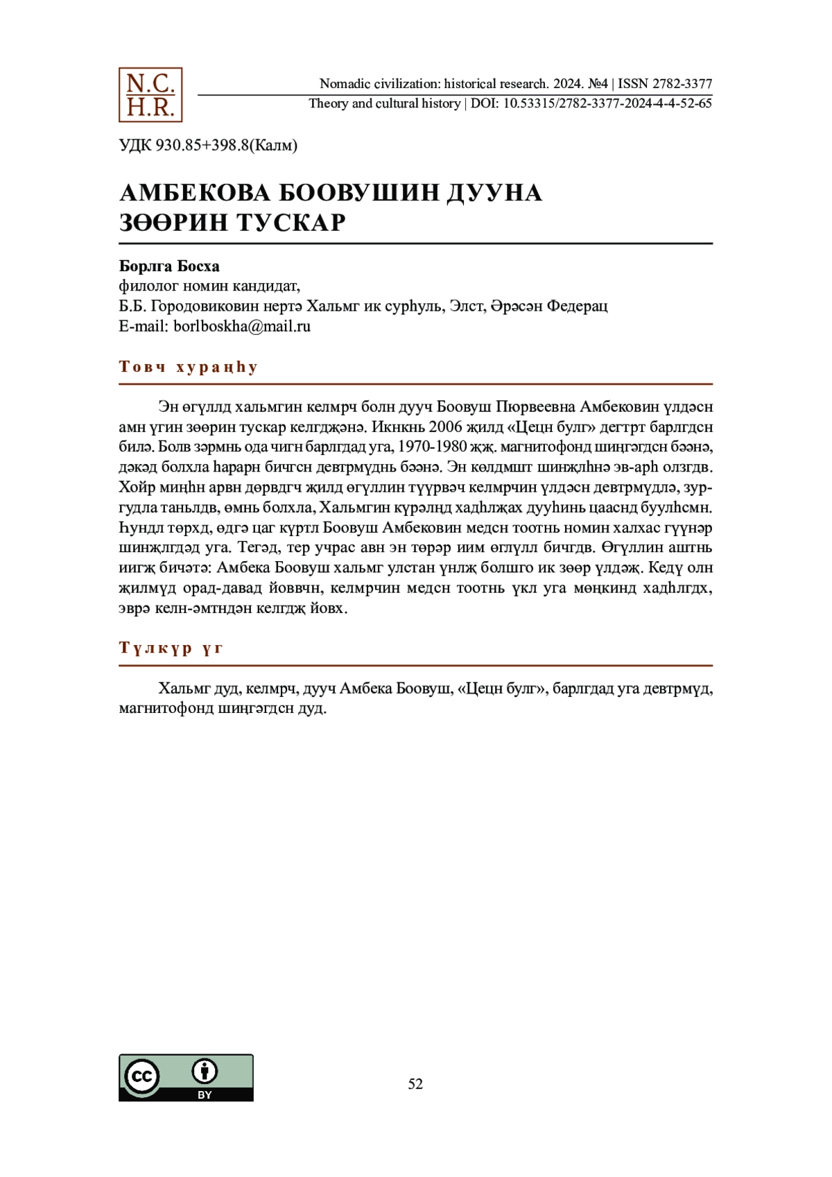 4. Манжилеева, Р. (2006). Хальмг заң-бәрц хадһлҗ йовх Боовуш ээҗ. Хальмг үнн, 31 августа.