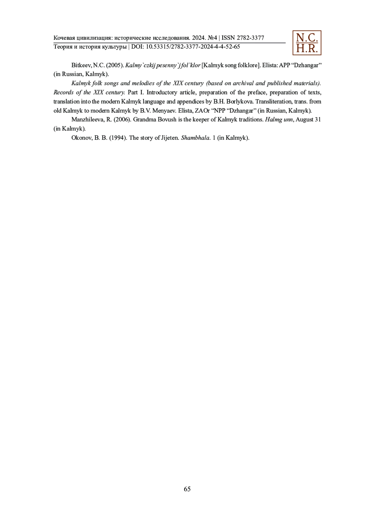 2. Биткеев, Н.Ц. (2005). Калмыцкий песенный фольклор. Элиста: АПП «Джангар».