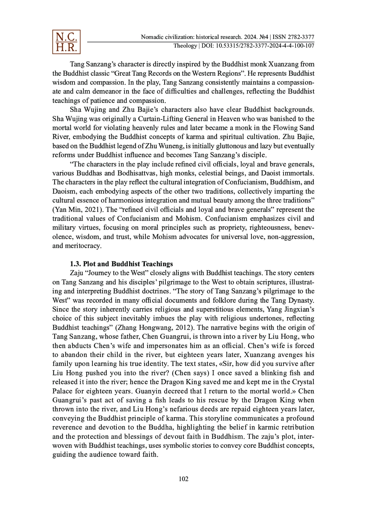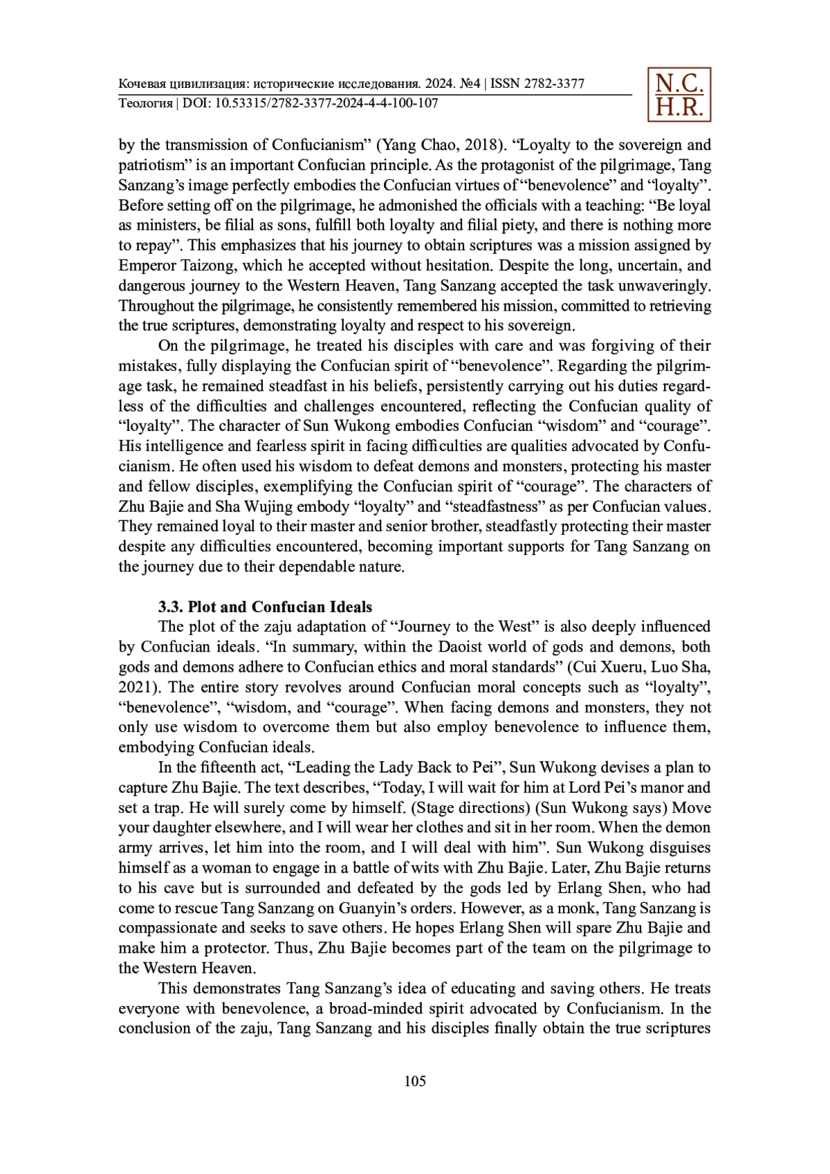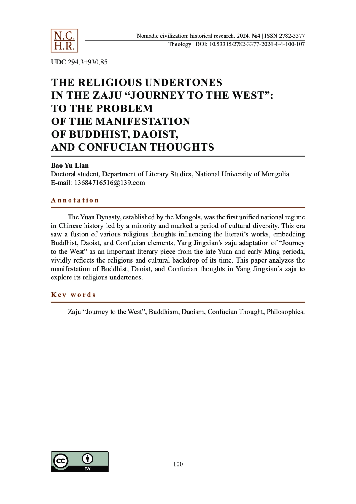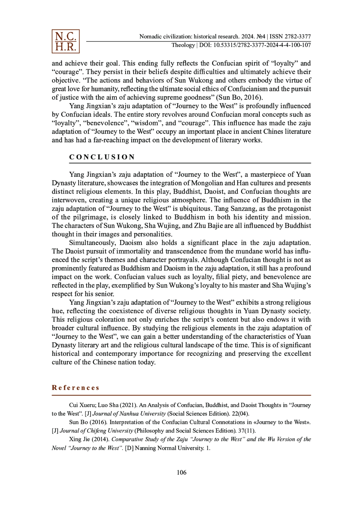 The Yuan Dynasty, established by the Mongols, was the first unified national regime in Chinese history led by a minority and marked a period of cultural diversity. This era saw a fusion of various religious thoughts influencing the literati’s works, embedding Buddhist, Daoist, and Confucian elements. Yang Jingxian’s zaju adaptation of “Journey to the West” as an important literary piece from the late Yuan and early Ming periods, vividly reflects the religious and cultural backdrop of its time. This paper analyzes the manifestation of Buddhist, Daoist, and Confucian thoughts in Yang Jingxian’s zaju to explore its religious undertones.