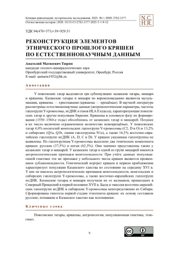 У поволжских татар выделяется три субпопуляции: казанские татары, мишари и кряшены. Казанские татары и мишари по вероисповеданию являются мусульманами, кряшены — христианами (кряшены — крещёные). В научной литературе рассмотрены естественнонаучные данные (антропологические параметры, частоты гаплогрупп Y-хромосомы, мтДНК и генов HLA II класса), характеризующие поволжских татар и другие популяции Евразии. Кряшены в основную фазу их формирования (1550–1560-е годы) обособились от казанских татар и мишарей. Позднее в их число включено ограниченное количество новокрещёных. У поволжских татар 4,0% носителей монгольских гаплогрупп Y-хромосомы (C2, D и O) и 13,2% и сибирских (Q1a, Q1b, линии гаплогруппы N1a), а также 16,5% восточно-евразийских гаплогрупп мтДНК (A, D, C и D). У кряшен указанные гаплогруппы не выявлены. По гаплогруппам Y-хромосомы выделено два этнических компонента кряшен: русские (37,5%) и ногаи (62,5%). Они значимо представлены также у казанских татар и мишарей. У казанских татар и одной из групп мишарей имеются антропологические признаки монголоидности. При учёте данных популяционной генетики эти же признаки у небольшого числа кряшен являются проявлением сублапоноидности. Генетический портрет кряшен в первом приближении характеризует популяции Казанского ханства по состоянию на середину XVI в. У них не имелось антропологических признаков монголоидности, монгольских и сибирских гаплогрупп Y-хромосомы, а также восточно-евразийских гаплогрупп мтДНК. Казанские татары и мишари получили их от калмыков, пришедших в Северный Прикаспий в первой половине XVII в. Была и эмиссия восточно-евразийских гаплогрупп мтДНК и сибирских Y-хромосомы непосредственно из Сибири. Сформирована гипотеза первой стадии этногенеза кряшен: их основу составили русские, попавшие в Казанское ханство как полоняники.