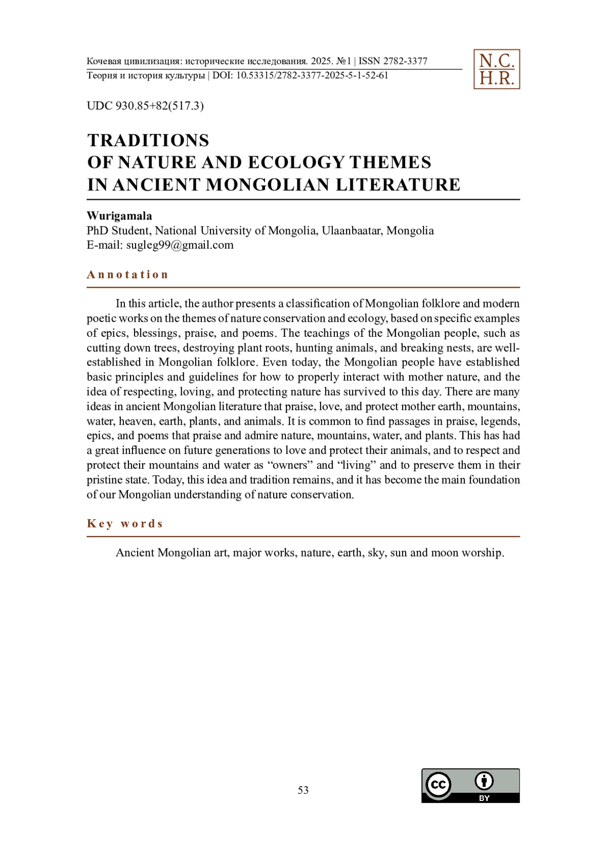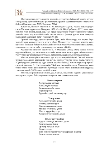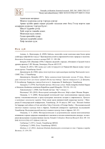 10. Омакаева, Э. У. (2024). Метеорологические и астрономические знания монголоязычных кочевников в зеркале природно-ландшафтного лексикона в погодно-климатическом дискурсе: на материале фольклорных и художественных текстов. Nomadic Civilization: Historical Research. 4(2). 105-114. https://doi.org/10.53315/2782-3377-2024-4-2-105-114.