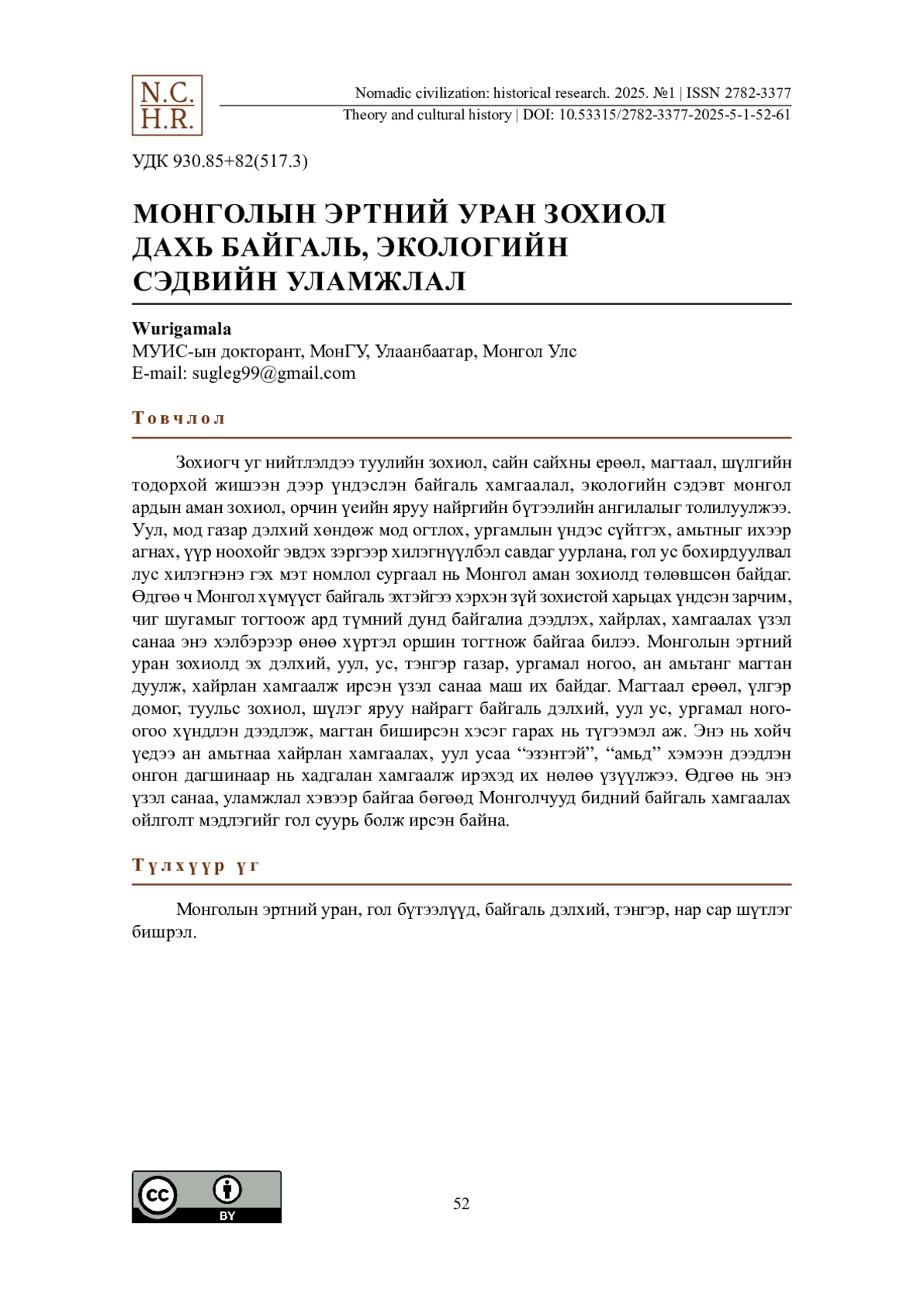 1. Алимаа, А., Цэвээндорж, Д. (2020). Байгаль, экологийн сэдэвт монголын аман болон орчин yеийн яруу найргийн бyтээлyyд (= Произведения устной и современной поэзии о природе и экологии). Бюллетень Калмыцкого научного центра РАН. 2 3. 189-206.