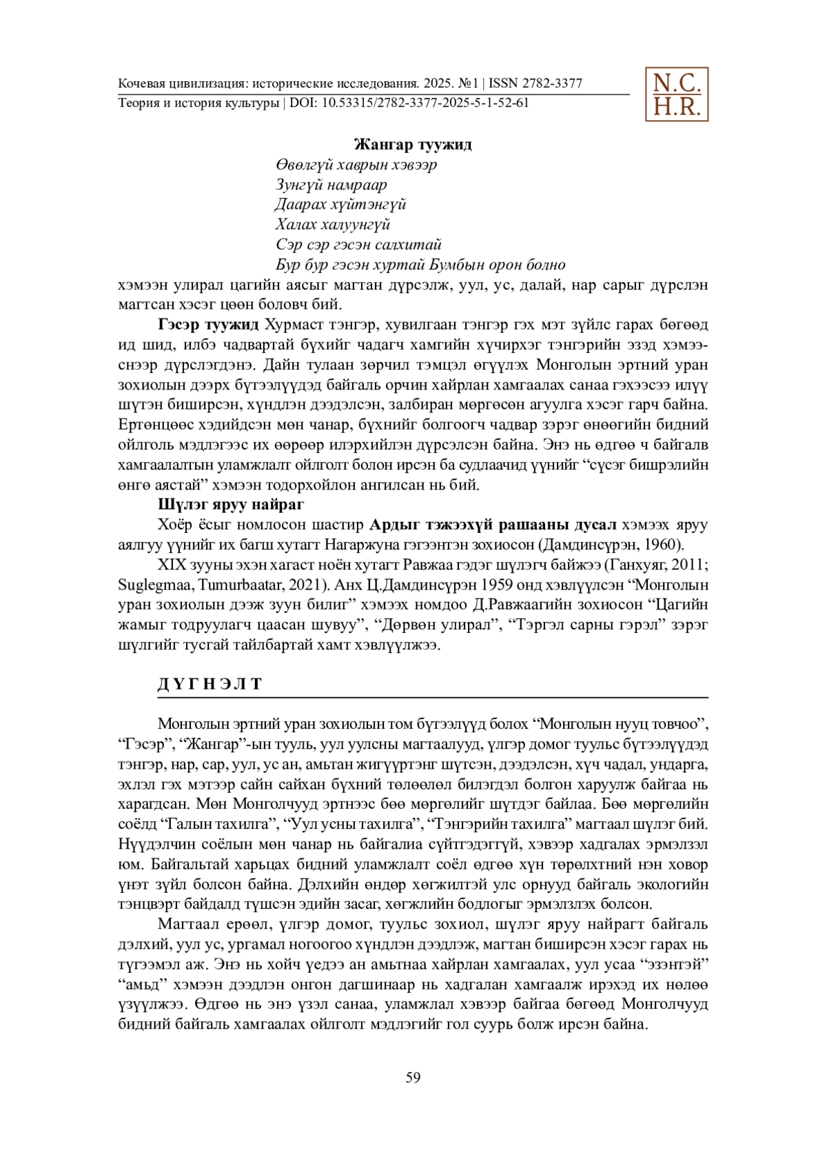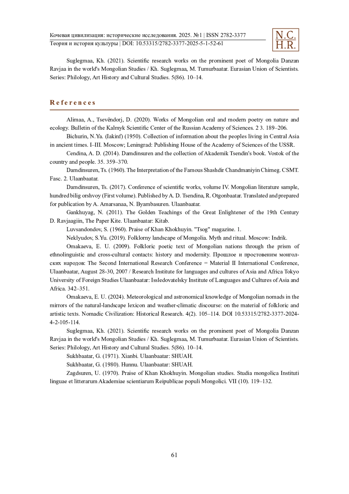 14. Suglegmaa, Kh. (2021). Scientific research works on the prominent poet of Mongolia Danzan Ravjaa in the world’s Mongolian Studies / Kh. Suglegmaa, M. Tumurbaatar. Eurasian Union of Scientists. Series: Philology, Art History and Cultural Studies. 5(86). 10-14.