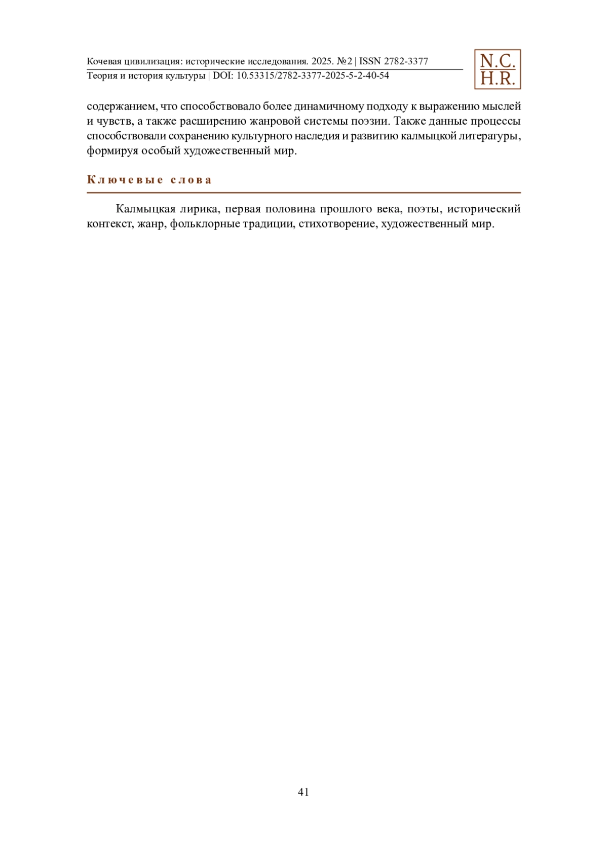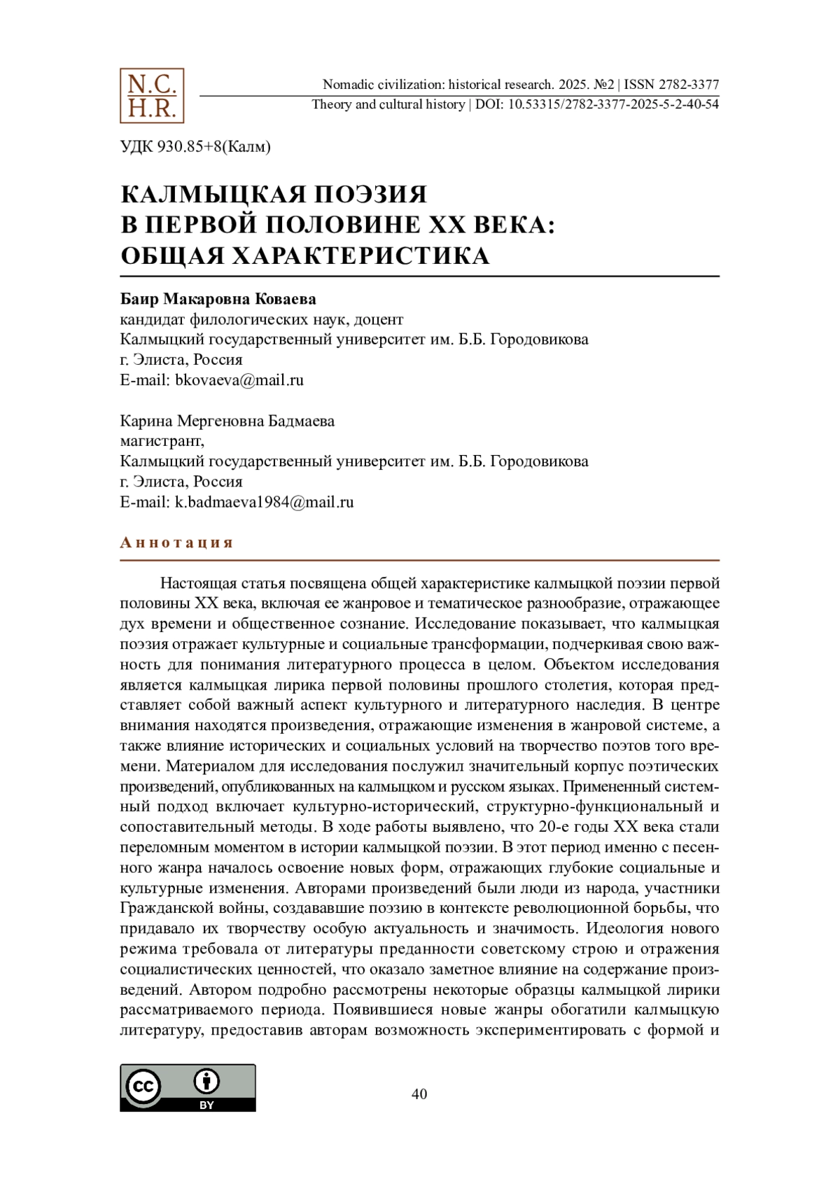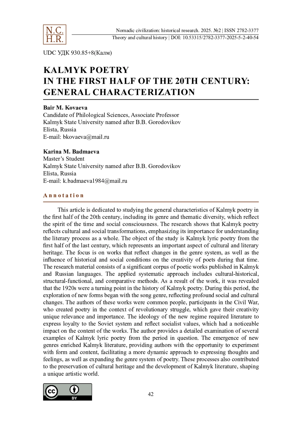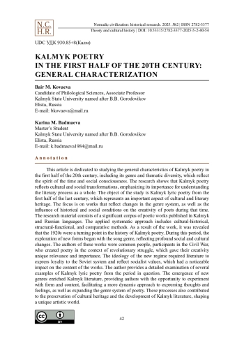 Настоящая статья посвящена общей характеристике калмыцкой поэзии первой половины ХХ века, включая ее жанровое и тематическое разнообразие, отражающее дух времени и общественное сознание. Исследование показывает, что калмыцкая поэзия отражает культурные и социальные трансформации, подчеркивая свою важность для понимания литературного процесса в целом. Объектом исследования является калмыцкая лирика первой половины прошлого столетия, которая представляет собой важный аспект культурного и литературного наследия. В центре внимания находятся произведения, отражающие изменения в жанровой системе, а также влияние исторических и социальных условий на творчество поэтов того времени. Материалом для исследования послужил значительный корпус поэтических произведений, опубликованных на калмыцком и русском языках. Примененный системный подход включает культурно-исторический, структурно-функциональный и сопоставительный методы. В ходе работы выявлено, что 20-е годы ХХ века стали переломным моментом в истории калмыцкой поэзии. В этот период именно с песенного жанра началось освоение новых форм, отражающих глубокие социальные и культурные изменения. Авторами произведений были люди из народа, участники Гражданской войны, создававшие поэзию в контексте революционной борьбы, что придавало их творчеству особую актуальность и значимость. Идеология нового режима требовала от литературы преданности советскому строю и отражения социалистических ценностей, что оказало заметное влияние на содержание произведений. Автором подробно рассмотрены некоторые образцы калмыцкой лирики рассматриваемого периода. Появившиеся новые жанры обогатили калмыцкую литературу, предоставив авторам возможность экспериментировать с формой и содержанием, что способствовало более динамичному подходу к выражению мыслей и чувств, а также расширению жанровой системы поэзии. Также данные процессы способствовали сохранению культурного наследия и развитию калмыцкой литературы, формируя особый художественный мир.