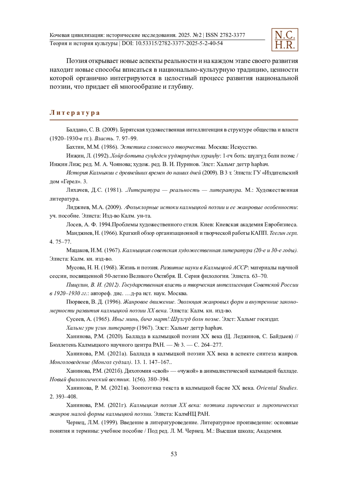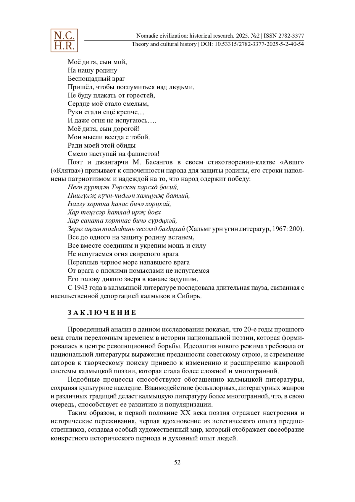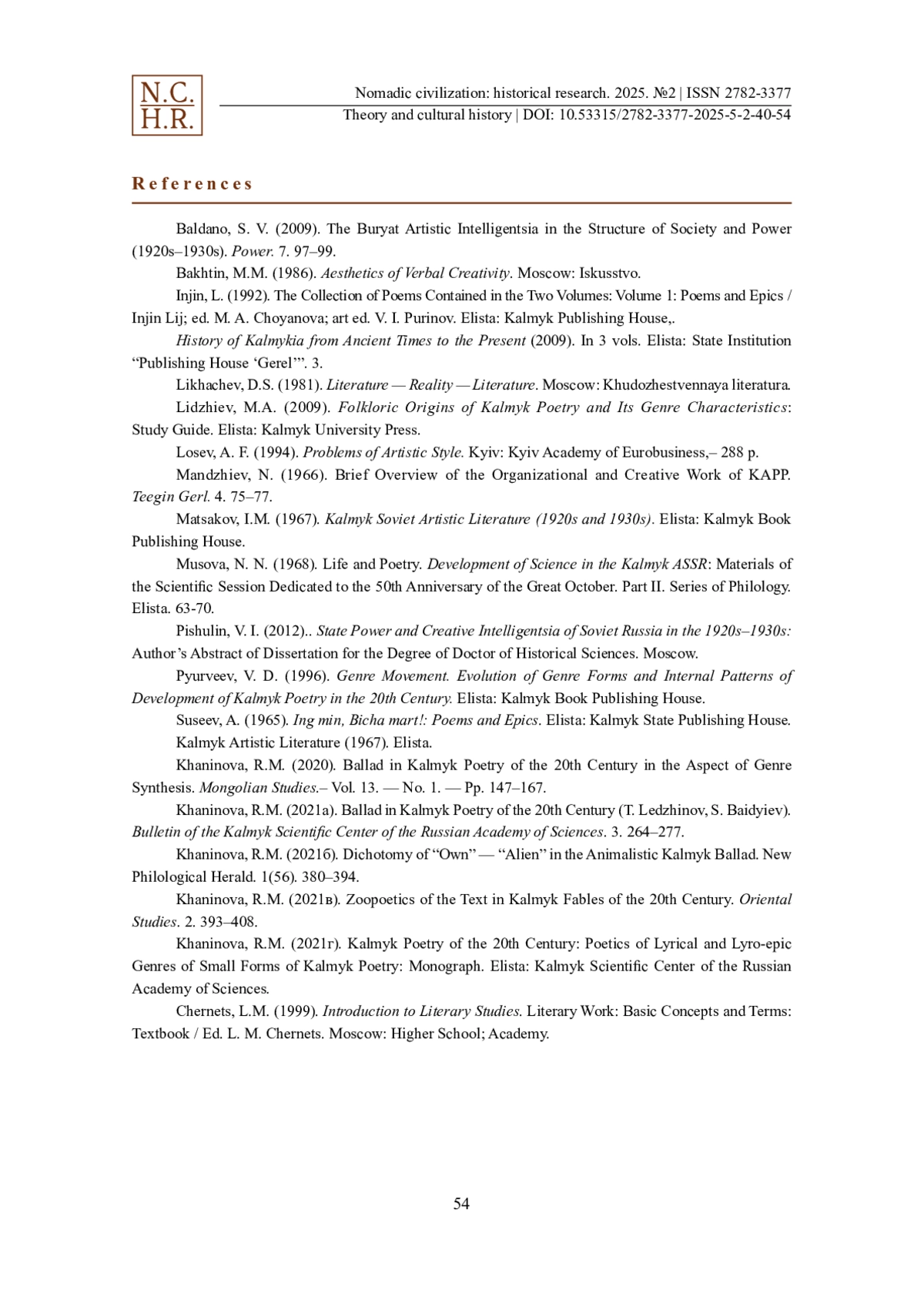 Настоящая статья посвящена общей характеристике калмыцкой поэзии первой половины ХХ века, включая ее жанровое и тематическое разнообразие, отражающее дух времени и общественное сознание. Исследование показывает, что калмыцкая поэзия отражает культурные и социальные трансформации, подчеркивая свою важность для понимания литературного процесса в целом. Объектом исследования является калмыцкая лирика первой половины прошлого столетия, которая представляет собой важный аспект культурного и литературного наследия. В центре внимания находятся произведения, отражающие изменения в жанровой системе, а также влияние исторических и социальных условий на творчество поэтов того времени. Материалом для исследования послужил значительный корпус поэтических произведений, опубликованных на калмыцком и русском языках. Примененный системный подход включает культурно-исторический, структурно-функциональный и сопоставительный методы. В ходе работы выявлено, что 20-е годы ХХ века стали переломным моментом в истории калмыцкой поэзии. В этот период именно с песенного жанра началось освоение новых форм, отражающих глубокие социальные и культурные изменения. Авторами произведений были люди из народа, участники Гражданской войны, создававшие поэзию в контексте революционной борьбы, что придавало их творчеству особую актуальность и значимость. Идеология нового режима требовала от литературы преданности советскому строю и отражения социалистических ценностей, что оказало заметное влияние на содержание произведений. Автором подробно рассмотрены некоторые образцы калмыцкой лирики рассматриваемого периода. Появившиеся новые жанры обогатили калмыцкую литературу, предоставив авторам возможность экспериментировать с формой и содержанием, что способствовало более динамичному подходу к выражению мыслей и чувств, а также расширению жанровой системы поэзии. Также данные процессы способствовали сохранению культурного наследия и развитию калмыцкой литературы, формируя особый художественный мир.