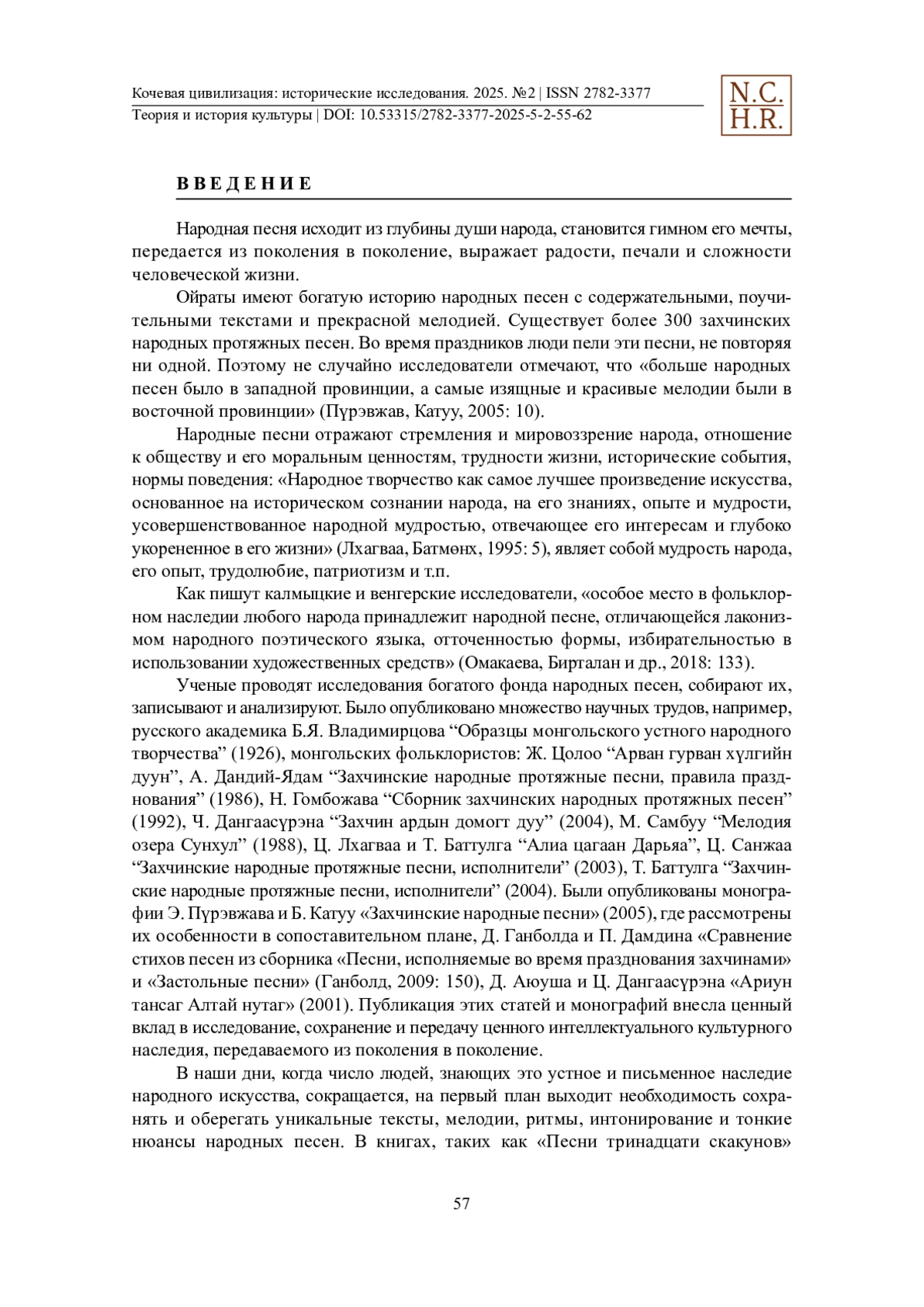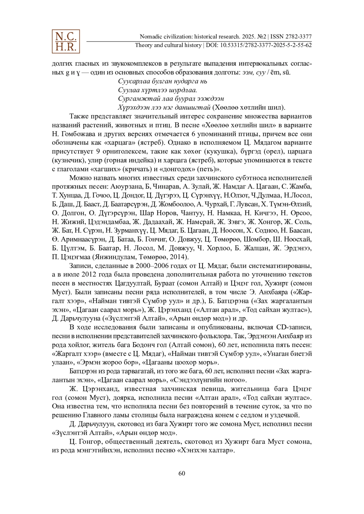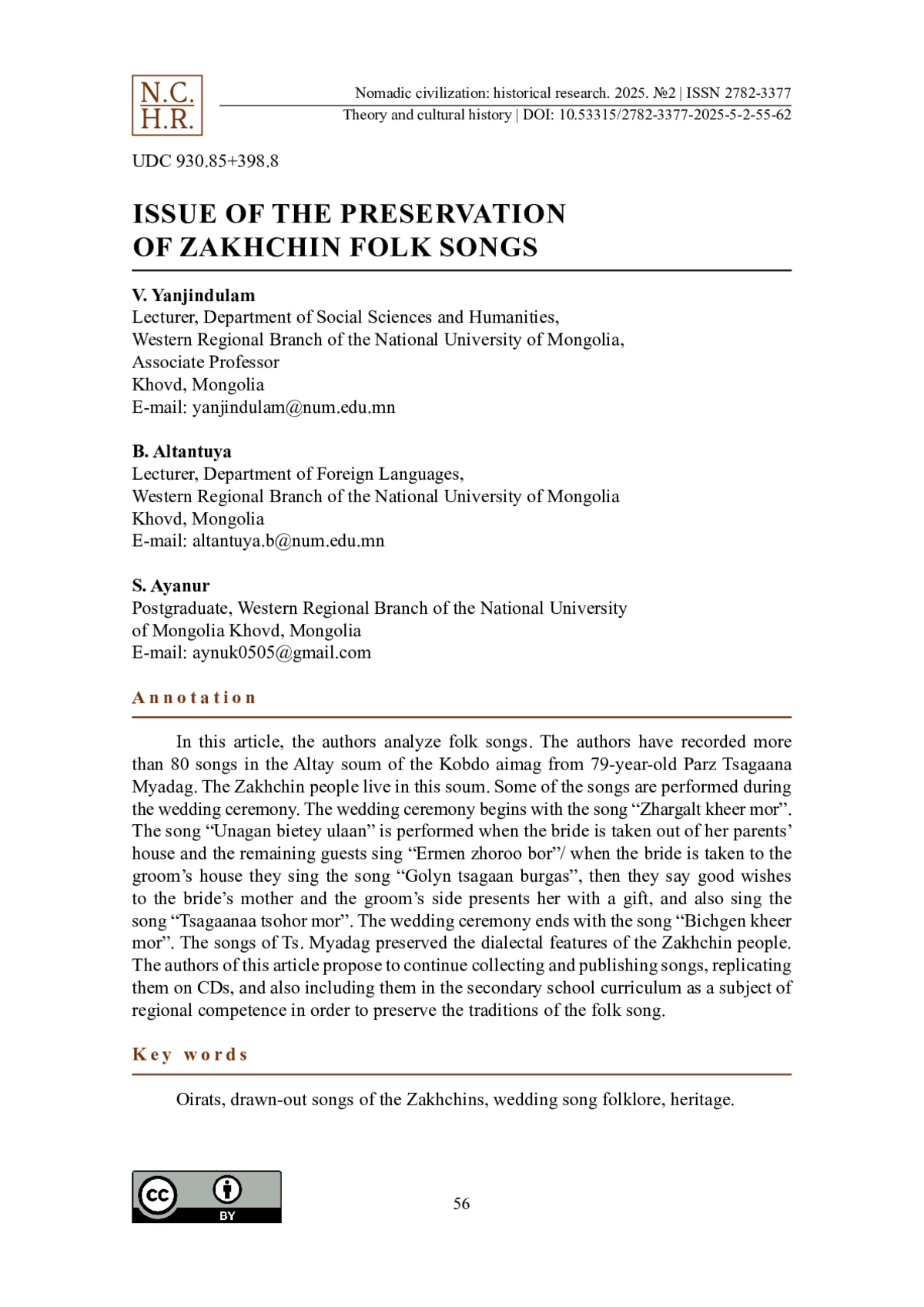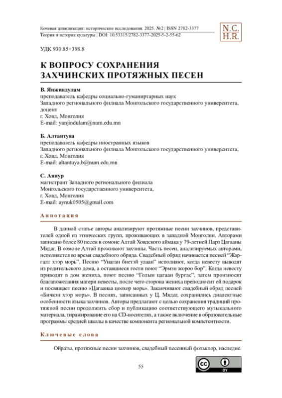 В данной статье авторы анализируют протяжные песни захчинов, представителей одной из этнических групп, проживающих в западной Монголии. Авторами записано более 80 песен в сомоне Алтай Ховдского аймака у 79-летней Парз Цагааны Мядаг. В сомоне Алтай проживают захчины. Часть песен, анализируемых авторами, исполняется во время свадебного обряда. Свадебный обряд начинается песней “Жаргалт хээр морь”. Песню “Унаган биетэй улаан” исполняют, когда невесту выводят из родительского дома, а оставшиеся гости поют “Эрмэн жороо бор”. Когда невесту приводят в дом жениха, поют песню “Голын цагаан бургас”, затем произносят благапожелания матери невесты, после чего сторона жениха преподносит ей подарок и посвящает песню «Цагаанаа цоохор морь». Заканчивают свадебный обряд песней «Бичкэн хээр морь». В песнях, записанных у Ц. Мядаг, сохранились диалектные особенности языка захчинов. Авторы предлагают с целью сохранения традиций протяжной песни продолжить сбор и публикацию соответствующего музыкального материала, тиражирование его на CD-носителях, а также включение в образовательные программы средней школы в качестве компонента региональной компетентности.