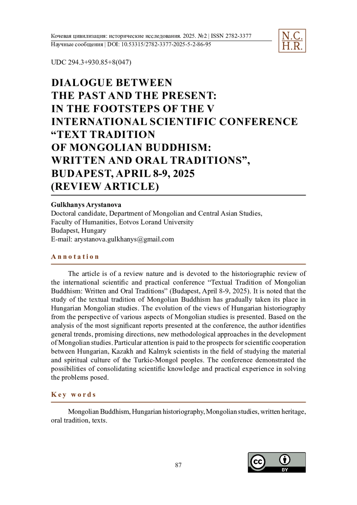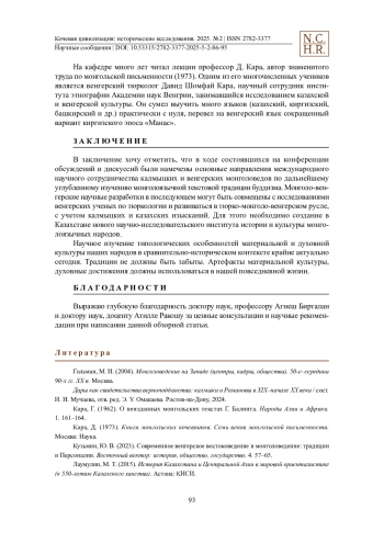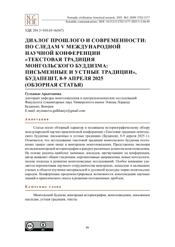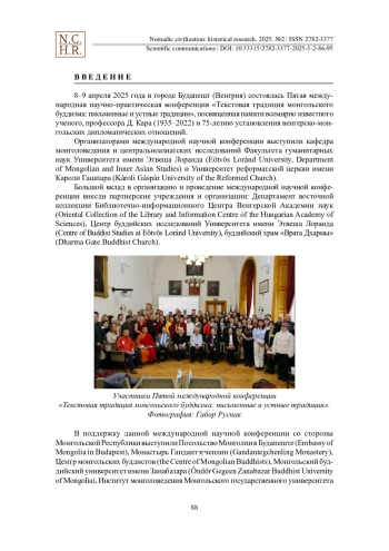 Статья носит обзорный характер и посвящена историографическому обзору международной научно-практической конференции «Текстовая традиция монгольского буддизма: письменные и устные традиции» (Будапешт, 8-9 апреля 2025 г.). Отмечается, что исследование текстовой традиции монгольского буддизма постепенно заняло свою нишу в венгерском монголоведении. Представлена эволюция взглядов венгерской историографии в ракурсе различных аспектов монголоведения. На основе анализа наиболее значимых докладов, прозвучавших на конференции, автор выявляет общие тенденции, перспективные направления, новые методологические подходы в развитии монголоведных исследований. Особое внимание уделяется перспективам научного сотрудничества венгерских, казахских и калмыцких ученых в области изучения материальной и духовной культуры тюрко-монгольских народов. Конференция продемонстрировала возможности консолидации научных знаний и практического опыта в решении поставленных проблем
