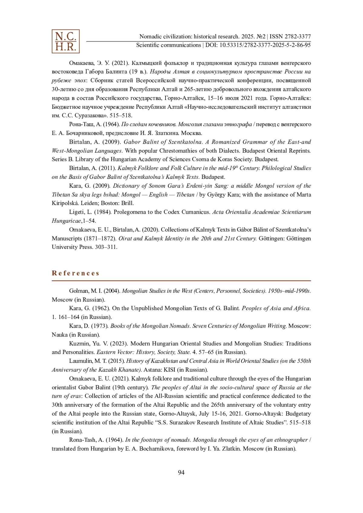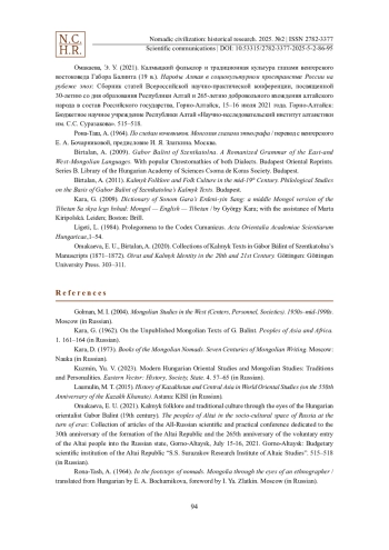7. Омакаева, Э. У. (2021). Калмыцкий фольклор и традиционная культура глазами венгерского востоковеда Габора Балинта (19 в.). Народы Алтая в социокультурном пространстве России на рубеже эпох: Сборник статей Всероссийской научно-практической конференции, посвященной 30-летию со дня образования Республики Алтай и 265-летию добровольного вхождения алтайского народа в состав Российского государства, Горно-Алтайск, 15-16 июля 2021 года. Горно-Алтайск: Бюджетное научное учреждение Республики Алтай «Научно-исследовательский институт алтаистики им. С.С. Суразакова». 515-518.