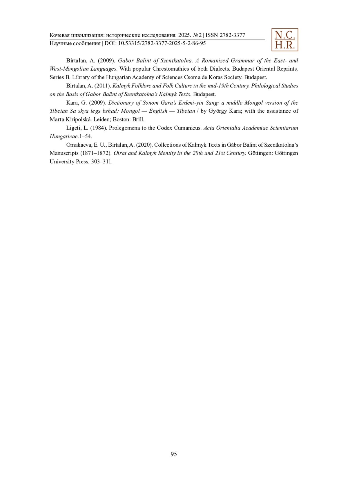 10. Birtalan, A. (2011). Kalmyk Folklore and Folk Culture in the mid-19th Century. Philological Studies on the Basis of Gabor Balint of Szentkatolna’s Kalmyk Texts. Budapest.
