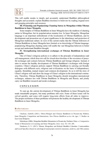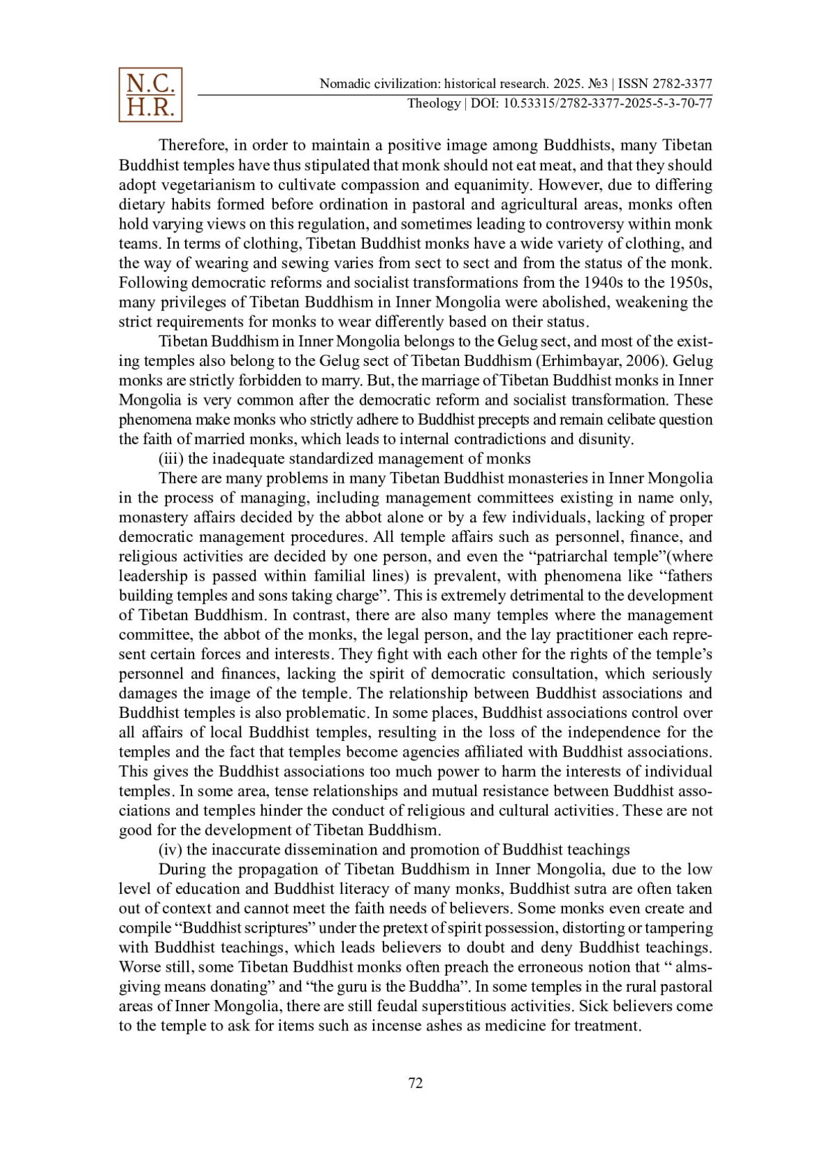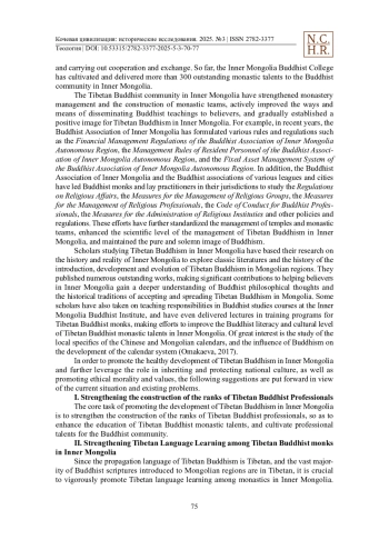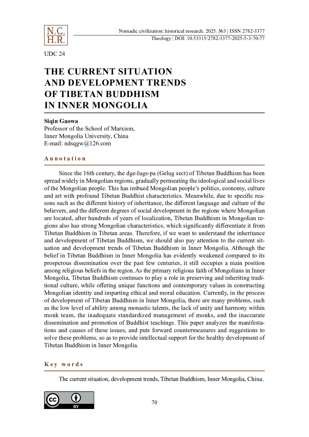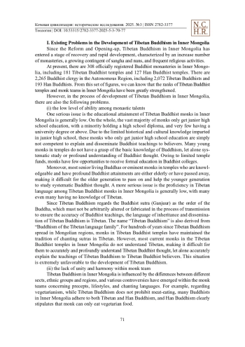 Since the 16th century, the dge-lugs-pa (Gelug sect) of Tibetan Buddhism has been spread widely in Mongolian regions, gradually permeating the ideological and social lives of the Mongolian people. This has imbued Mongolian people’s politics, economy, culture and art with profound Tibetan Buddhist characteristics. Meanwhile, due to specific reasons such as the different history of inheritance, the different language and culture of the believers, and the different degrees of social development in the regions where Mongolian are located, after hundreds of years of localization, Tibetan Buddhism in Mongolian regions also has strong Mongolian characteristics, which significantly differentiate it from Tibetan Buddhism in Tibetan areas. Therefore, if we want to understand the inheritance and development of Tibetan Buddhism, we should also pay attention to the current situation and development trends of Tibetan Buddhism in Inner Mongolia. Although the belief in Tibetan Buddhism in Inner Mongolia has evidently weakened compared to its prosperous dissemination over the past few centuries, it still occupies a main position among religious beliefs in the region. As the primary religious faith of Mongolians in Inner Mongolia, Tibetan Buddhism continues to play a role in preserving and inheriting traditional culture, while offering unique functions and contemporary values in constructing Mongolian identity and imparting ethical and moral education. Currently, in the process of development of Tibetan Buddhism in Inner Mongolia, there are many problems, such as the low level of ability among monastic talents, the lack of unity and harmony within monk team, the inadequate standardized management of monks, and the inaccurate dissemination and promotion of Buddhist teachings. This paper analyzes the manifestations and causes of these issues, and puts forward countermeasures and suggestions to solve these problems, so as to provide intellectual support for the healthy development of Tibetan Buddhism in Inner Mongolia.