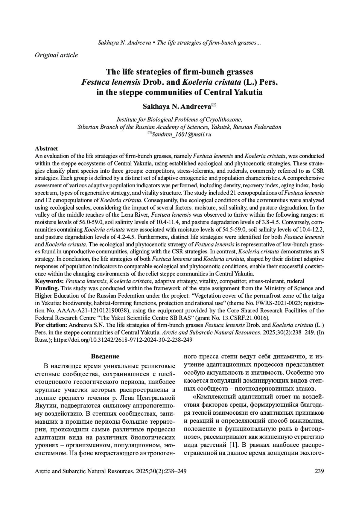 10. Kardashevskaya, V.E., Egorova N.N. Populations of Agrostis diluta Kurcz. and Psathyrostachys caespitosa (Sukaczev) Peschkova in Yakutia: dynamics of vitality. Acta Biologica Sibirica. 2021;7:491-503. DOI: 10.3897/abs.7.e78452