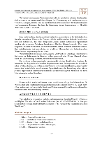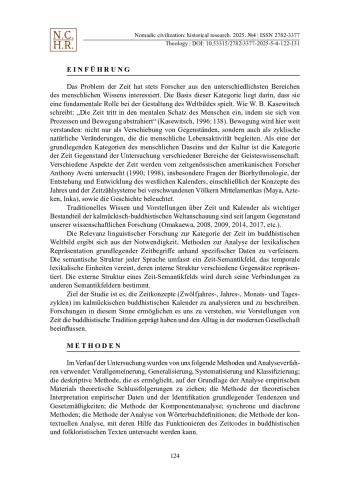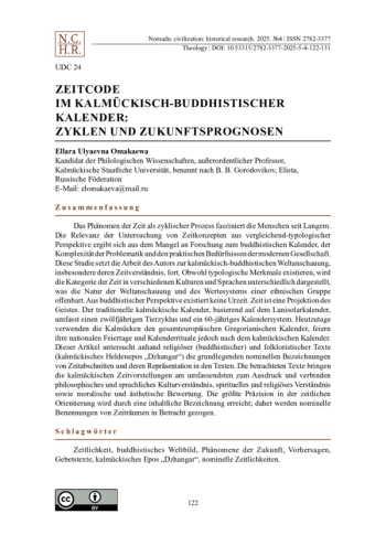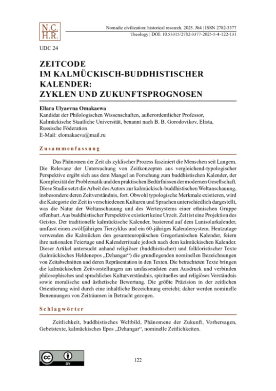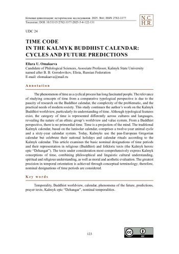 Das Phänomen der Zeit als zyklischer Prozess fasziniert die Menschen seit Langem. Die Relevanz der Untersuchung von Zeitkonzepten aus vergleichend-typologischer Perspektive ergibt sich aus dem Mangel an Forschung zum buddhistischen Kalender, der Komplexität der Problematik und den praktischen Bedürfnissen der modernen Gesellschaft. Diese Studie setzt die Arbeit des Autors zur kalmückisch-buddhistischen Weltanschauung, insbesondere deren Zeitverständnis, fort. Obwohl typologische Merkmale existieren, wird die Kategorie der Zeit in verschiedenen Kulturen und Sprachen unterschiedlich dargestellt, was die Natur der Weltanschauung und des Wertesystems einer ethnischen Gruppe offenbart. Aus buddhistischer Perspektive existiert keine Urzeit. Zeit ist eine Projektion des Geistes. Der traditionelle kalmückische Kalender, basierend auf dem Lunisolarkalender, umfasst einen zwölfjährigen Tierzyklus und ein 60-jähriges Kalendersystem. Heutzutage verwenden die Kalmücken den gesamteuropäischen Gregorianischen Kalender, feiern ihre nationalen Feiertage und Kalenderrituale jedoch nach dem kalmückischen Kalender. Dieser Artikel untersucht anhand religiöser (buddhistischer) und folkloristischer Texte (kalmückisches Heldenepos „Dzhangar“) die grundlegenden nominellen Bezeichnungen von Zeitabschnitten und deren Repräsentation in den Texten. Die betrachteten Texte bringen die kalmückischen Zeitvorstellungen am umfassendsten zum Ausdruck und verbinden philosophisches und sprachliches Kulturverständnis, spirituelles und religiöses Verständnis sowie moralische und ästhetische Bewertung. Die größte Präzision in der zeitlichen Orientierung wird durch eine inhaltliche Bezeichnung erreicht; daher werden nominelle Benennungen von Zeiträumen in Betracht gezogen.