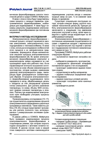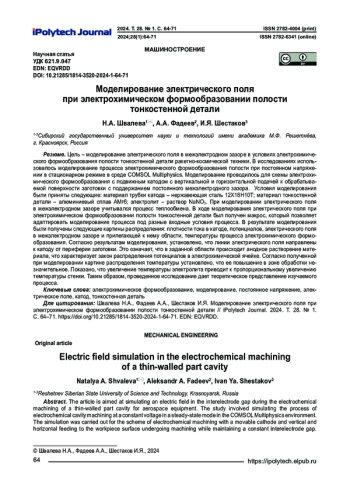 Цель – моделирование электрического поля в межэлектродном зазоре в условиях электрохимического формообразования полости тонкостенной детали ракетно-космической техники. В исследованиях использовалось моделирование процесса электрохимического формообразования полости при постоянном напряжении в стационарном режиме в среде COMSOL Multiphysics. Моделирование проводилось для схемы электрохимического формообразования с подвижным катодом с вертикальной и горизонтальной подачей к обрабатываемой поверхности заготовки с поддержанием постоянного межэлектродного зазора. Условия моделирования были приняты следующие: материал трубки катода – нержавеющая сталь 12Х18Н10Т; материал тонкостенной детали – алюминиевый сплав АМг6; электролит – раствор NaNO3. При моделировании электрического поля в межэлектродном зазоре учитывался процесс теплообмена. В ходе моделирования электрического поля при электрохимическом формообразовании полости тонкостенной детали был получен макрос, который позволяет адаптировать моделирование процесса под разные входные условия процесса. В результате моделирования были получены следующие картины распределения: плотности тока в катоде, потенциалов, электрического поля в межэлектродном зазоре и прилегающей к нему области, температуры процесса электрохимического формообразования. Согласно результатам моделирования, установлено, что линии электрического поля направлены к катоду от периферии заготовки. Это означает, что в заданной области происходит анодное растворение материала, что характеризует закон распределения потенциалов в электрохимической ячейке. Согласно полученной при моделировании картине распределения температуры установлено, что ее повышение в зоне обработки незначительное. Показано, что увеличение температуры электролита приводит к пропорциональному увеличению температуры стенки. Таким образом, проведенное исследование дает теоретическое представление изучаемого процесса.
