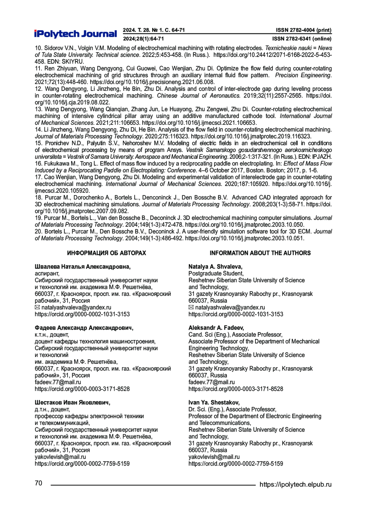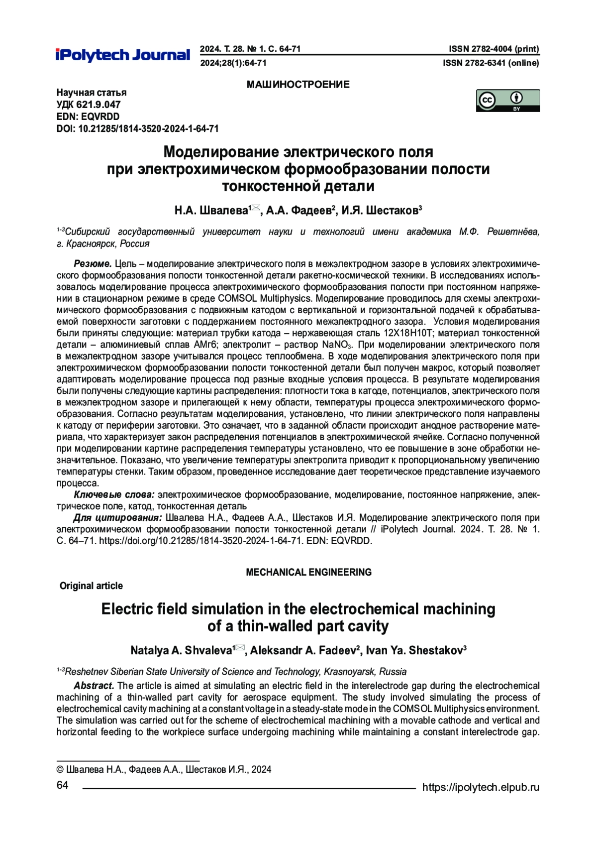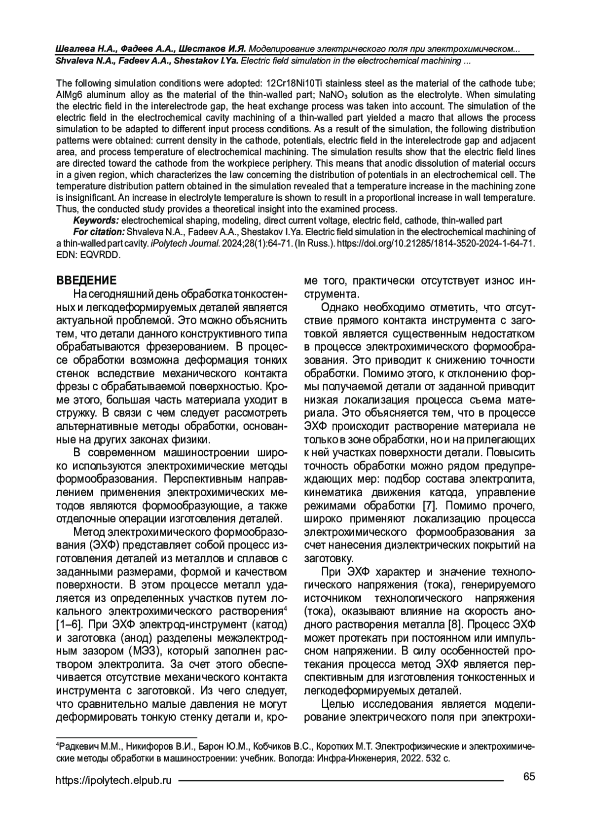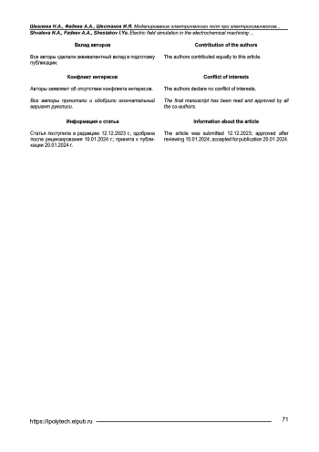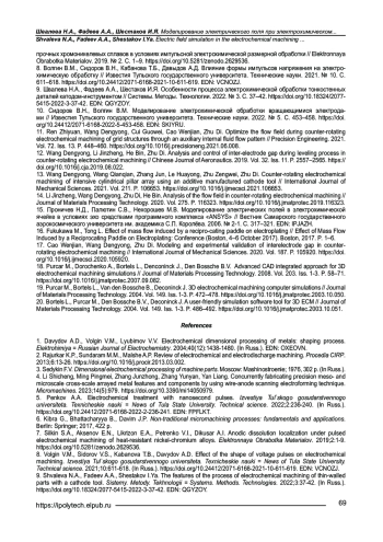 9. Shvaleva N.A., Fadeev A.A., Shestakov I.Ya. Osobennosti protsessa elektrokhimicheskoi obrabotki tonkostennykh detalei katodom-instrumentom // Sistemy. Metody. Tekhnologii. 2022. № 3. S. 37-42. https://doi.org/10.18324/2077-5415-2022-3-37-42. EDN: QGYZOY.