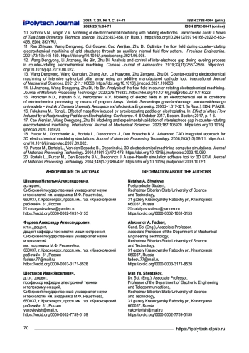 14. Li Jinzheng, Wang Dengyong, Zhu Di, He Bin. Analysis of the flow field in counter-rotating electrochemical machining // Journal of Materials Processing Technology. 2020. Vol. 275. P. 116323. https://doi.org/10.1016/j.jmatprotec.2019.116323.