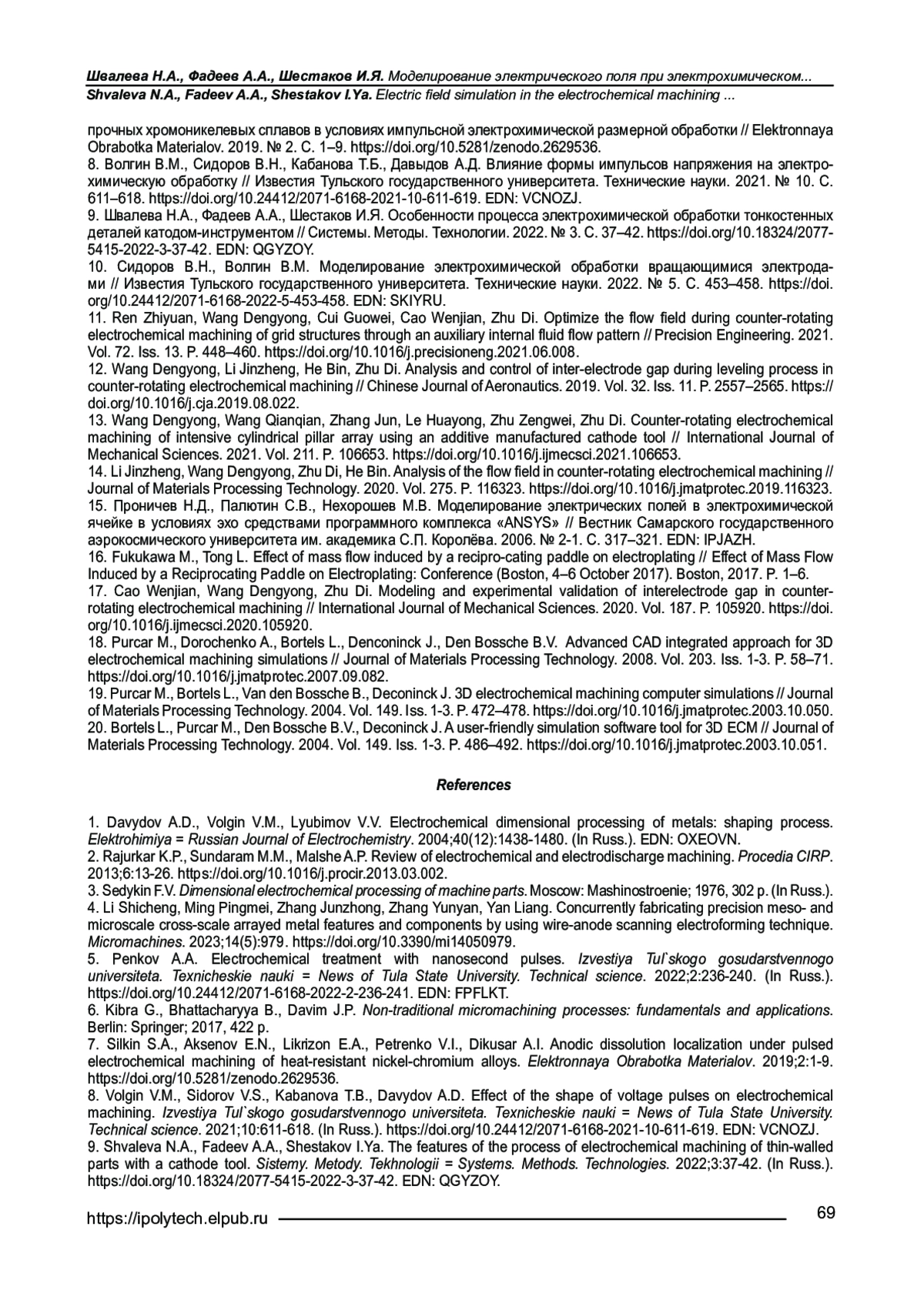 10. Sidorov V.N., Volgin V.M. Modelirovanie elektrokhimicheskoi obrabotki vrashchayushchimisya elektrodami // Izvestiya Tul’skogo gosudarstvennogo universiteta. Tekhnicheskie nauki. 2022. № 5. S. 453-458. https://doi.org/10.24412/2071-6168-2022-5-453-458. EDN: SKIYRU.
