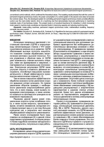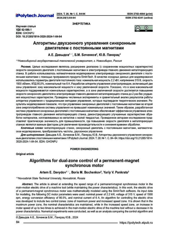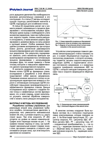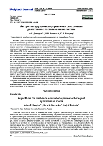 Целью исследования являлось расширение диапазона (с сохранением мощностных характеристик) скорости синхронного двигателя с постоянными магнитами в электроприводе главного движения металлорежущего станка. В работе использовалось математическое моделирование электропривода синхронного двигателя с постоянными магнитами с помощью программного продукта SimInTech. В качестве исходных данных для моделирования использовались параметры двигателя постоянного тока: номинальная мощность 2,2 кВт, напряжение 315 В, скорость 1500 об/мин, КПД 90,5%, номинальный ток 6 А. Разработан алгоритм управления электроприводом, включающий две зоны управления: зону максимальной мощности и зону увеличенной скорости. Показано, что в зоне максимальной мощности поддерживаются номинальные характеристики, а в зоне увеличенной скорости достигается повышение скорости синхронного двигателя в электроприводе главного движения металлорежущего станка до 2 раз без ухудшения мощностных характеристик. Проведены численные эксперименты и сравнительный анализ результатов работы алгоритма управления с традиционными методами управления, которые подтвердили теоретические значения. Результаты моделирования показали, что при управлении синхронных двигателей с постоянными магнитами во второй зоне энергопотребление системы управления не превышает номинальных значений. Таким образом, разработанная система управления синхронных двигателей с постоянными магнитами обеспечивает эффективное управление электроприводом главного движения металлорежущего станка, демонстрирующего улучшенные характеристики обработки материалов, изготавливаемых из металлов с малой твердостью. Проведенное авторами исследование представляет практическую значимость для промышленности, где повышение скорости двигателя в металлорежущих станках является важным фактором для увеличения производительности и снижения времени обработки.