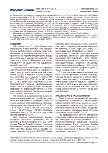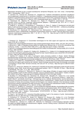 15. Medyanik N.L., Leont’eva E.V., Mullina E.R., Mishurina O.A. Mechanism of thermochemical interaction between old copper ore flotation tailings and chlorammonium reagents // Journal of Mining Science. 2020. Vol. 56. P. 457-463. https://doi.org/10.1134/S106273912003674X.