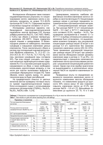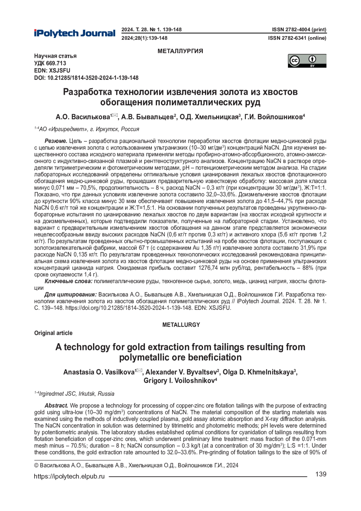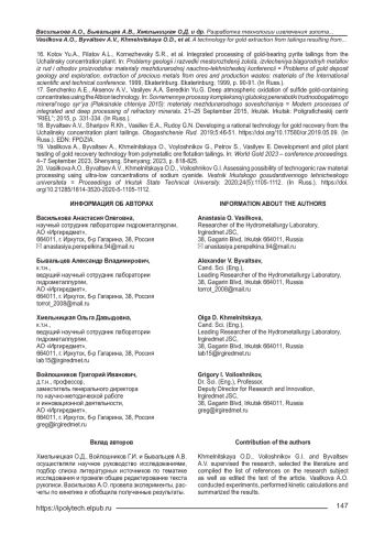 19. Vasilkova, A., Byvaltsev A., Khmelnitskaya O., Voyloshnikov G., Petrov S., Vasilyev E. Development and pilot plant testing of gold recovery technology from polymetallic ore flotation tailings // World Gold 2023 - conference proceedings (Shenyang, 4-7 September 2023). Shenyang, 2023. P. 818-825.