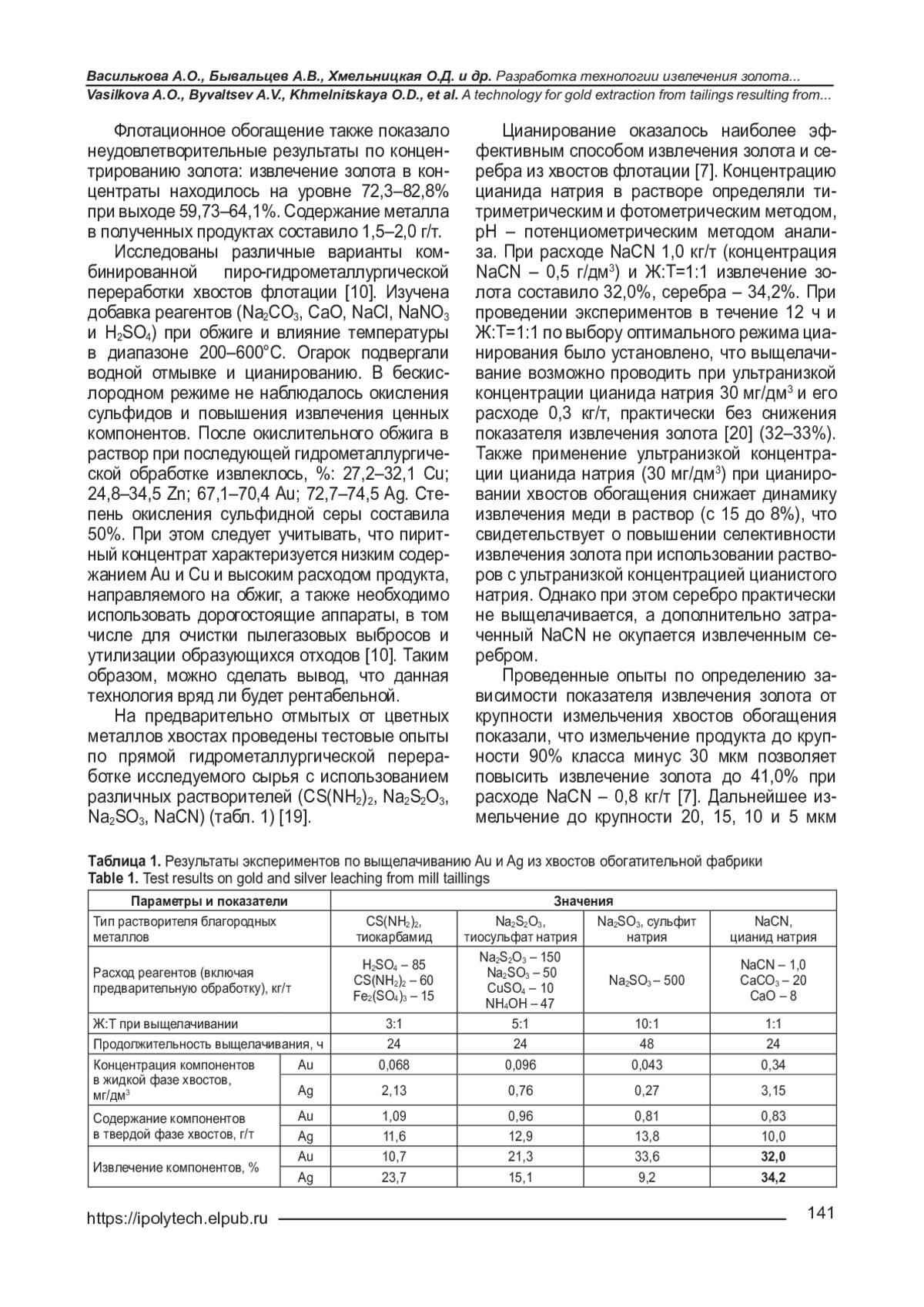 10. Byval’tsev A.V., Khmel’nitskaya O.D., Dement’ev V.E., Sharipov R.Kh., Gibadullin Z.R., Vasil’ev E.A. [i dr.]. Tsianidnaya tekhnologiya izvlecheniya zolota iz khvostov Uchalinskoi obogatitel’noi fabriki // Sovremennye tendentsii v oblasti teorii i praktiki dobychi i pererabotki mineral’nogo i tekhnogennogo syr’ya: materialy Mezhdunar. nauch.-tekhn. konf., priurochennoi k 90-letiyu so dnya osnovaniya instituta «Uralmekhanobr» (g. Ekaterinburg, 6-8 noyabrya 2019 g.). Ekaterinburg, 2019. S. 409-412. EDN: EQUFPI.