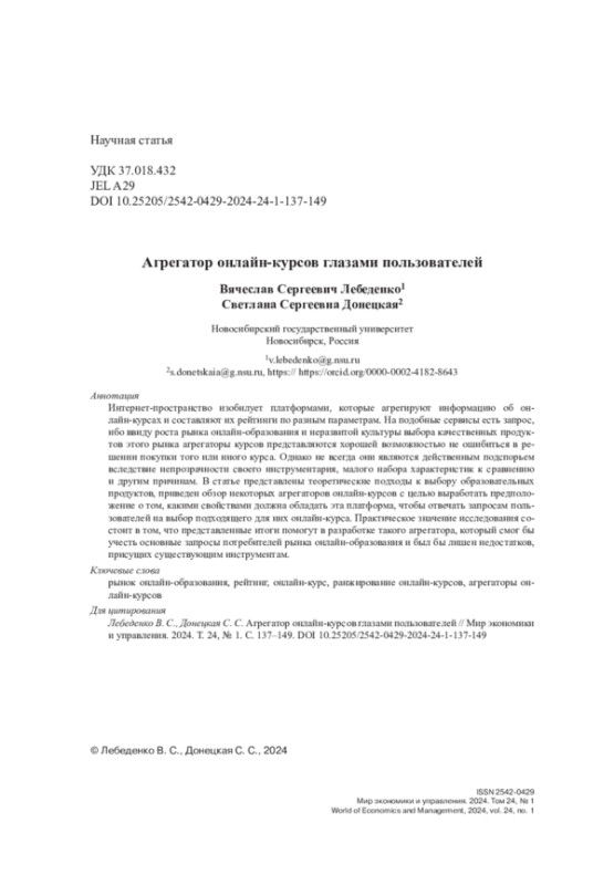 1. Винник А. Е., Прядко С. Н. Анализ показателей рынка и перспективы развития онлайн-образования в сегменте массовых открытых онлайн-курсов // Вестник Астраханского гос. техн. ун-та. Серия: Экономика. 2023. № 2. С. 118-124.