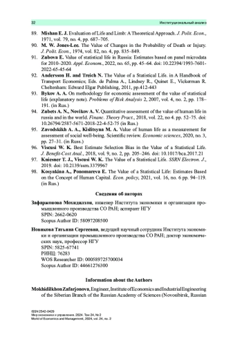 94. Зубец А. Н., Новиков А. В. Численная оценка стоимости жизни человека в России и в мире // Финансы теория и практика. 2018. Т. 22, № 4. С. 52-75. https://doi.org/10.26794/2587-5671-2018-22-4-52-75