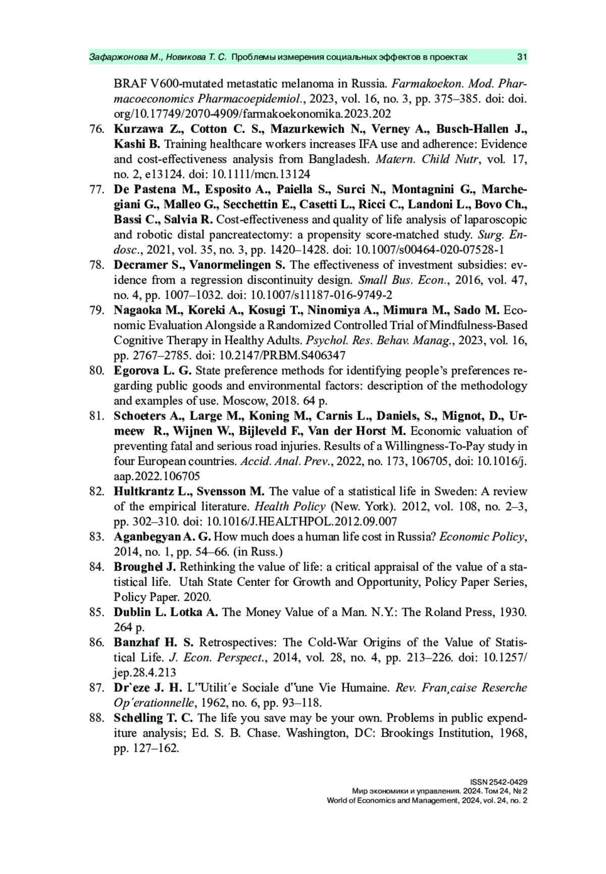 95. Заводских А. А., Кислицына М. А. Стоимость жизни человека как мера оценки благосостояния общества // Научное обозрение. Экономические науки. 2020. № 3. С. 27-31.