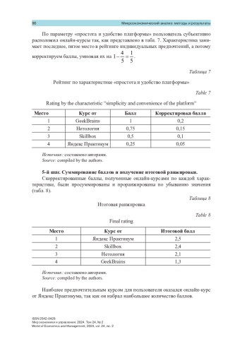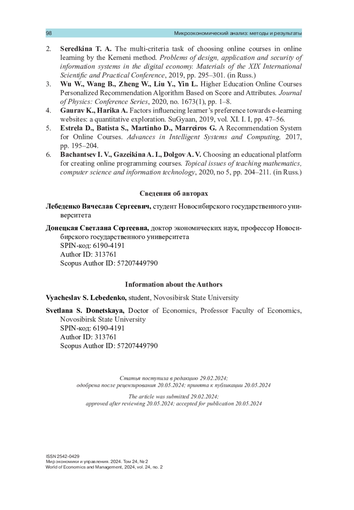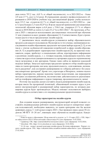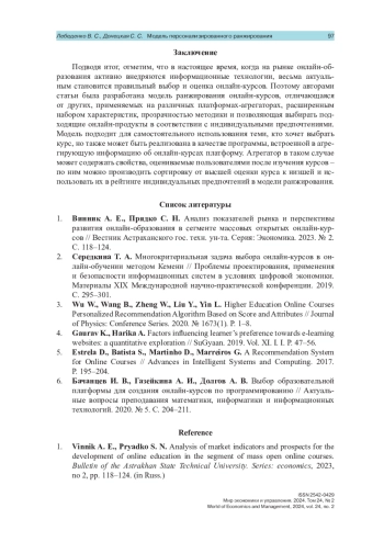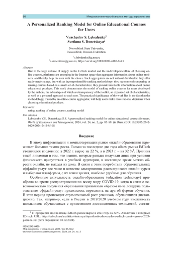 В силу большого объема предложения на EdTech-рынке и неразвитой культуры выбора онлайн-курсов в интернет-пространстве появляются платформы, которые агрегируют информацию об онлайн-продуктах и тем самым помогают пользователю с выбором. Подобные агрегаторы не лишены недостатков: предлагают готовые рейтинги, но с непонятной методикой ранжирования; рекомендуют сравнивать или ранжировать курсы по малому набору характеристик; предоставляют недостоверную информацию об образовательных онлайн-продуктах. Настоящая работа демонстрирует разработанную авторами модель ранжирования онлайн-курсов для пользователей, преимущества которой состоят в прозрачности инструментария, расширенном наборе характеристик, а также в персональном подходе к каждому пользователю. Практическое значение работы заключается в том, что методика, в случае ее использования агрегатором онлайн-курсов, поможет пользователям принимать более рациональные решения при выборе образовательных продуктов.