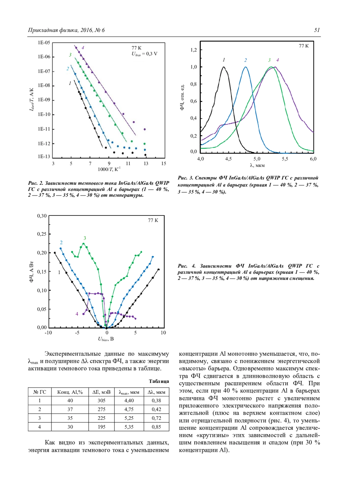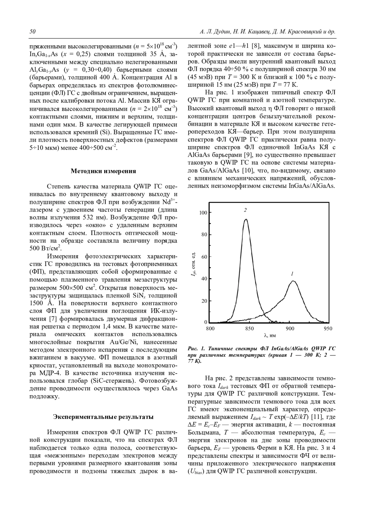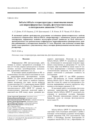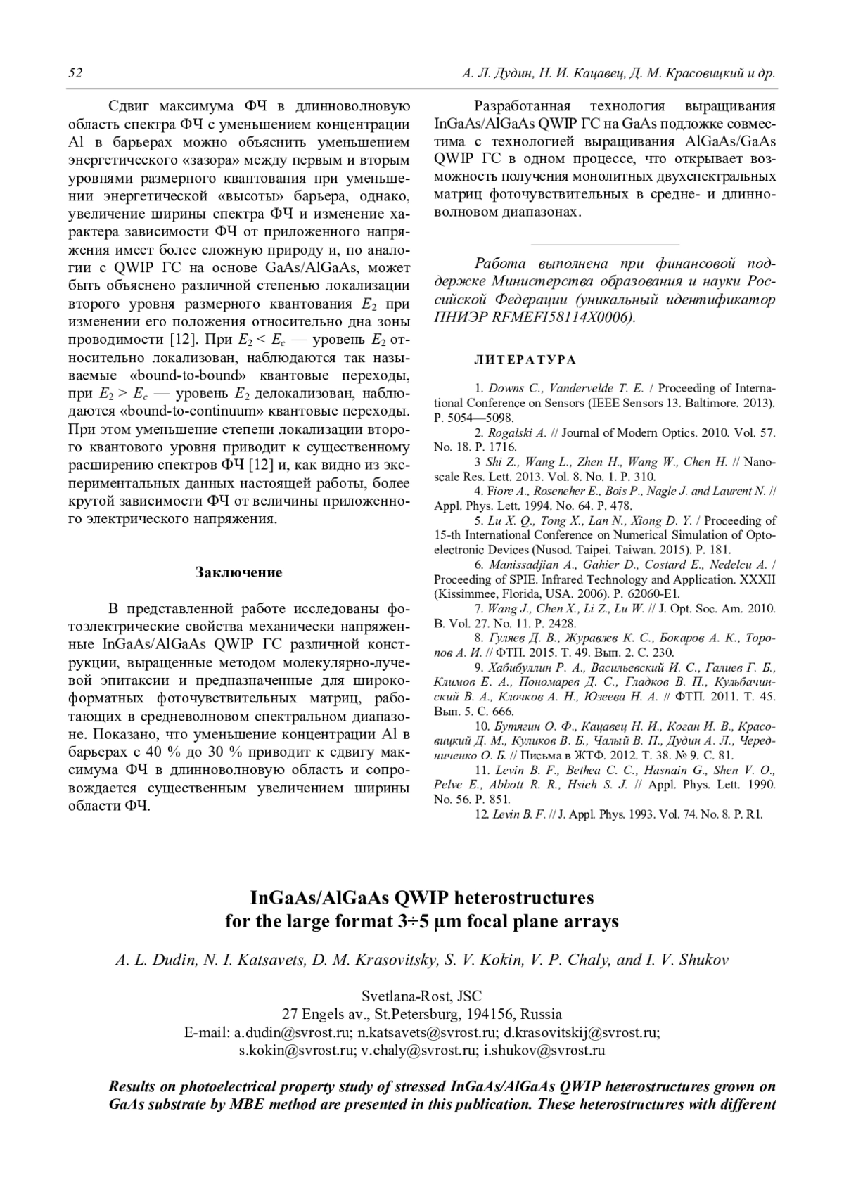 Дудин А. Л., Кацавец Н. И., Красовицкий Д. М., Кокин С. В., Чалый В. П., Шуков И. В. InGaAs/AlGaAs гетероструктуры с квантовыми ямами для широкоформатных матриц, фоточувствительных в спектральном диапазоне 3÷5 мкм 49