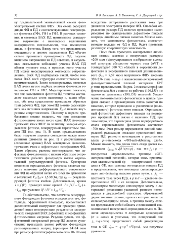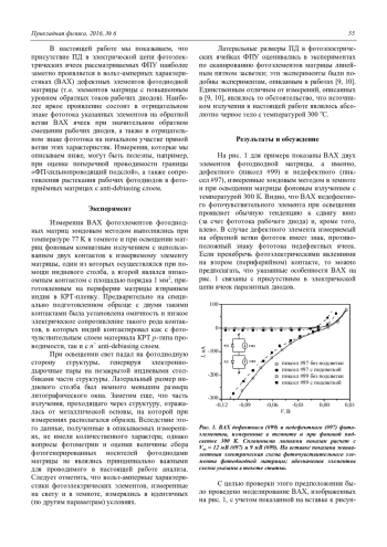 1. Из-за образования дополнительного p–n-перехода в каждой фотоэлектрической ячейке, легированный подслой n-типа проводимости в КРТфотоприемниках типа n-на-p приводит при освещении к появлению на паразитном диоде фотоэдс Voc ~ 10—20 мВ (для окружающего фона ~300 К). Эта фотоэдс сдвигает вольт-амперные характеристики фотоэлементов на величину Voc в сторону обратных смещений (по отношению к рабочим фотодиодам). На дефектных фотоэлементах с большой обратной (и прямой) проводимостью рабочих фотодиодов этот сдвиг приводит к отрицательному результирующему фототоку фотоэлектрической ячейки; соответственно, дефектные фотоэлементы ФПУ с высокой темновой проводимостью проявляют отрицательный фотосигнал.