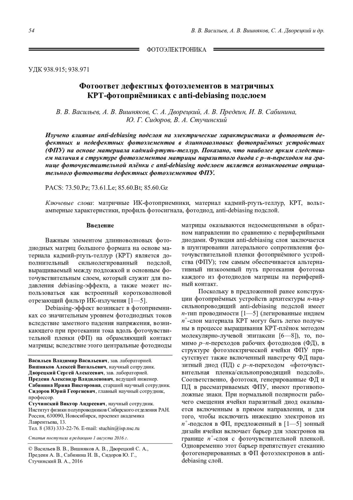 Васильев В. В., Вишняков А. В., Дворецкий С. А., Предеин А. В., Сабинина И. В., Сидоров Ю. Г., Стучинский В. А. Фотоответ дефектных фотоэлементов в матричных КРТ-фотоприёмниках с anti-debiasing подслоем 54