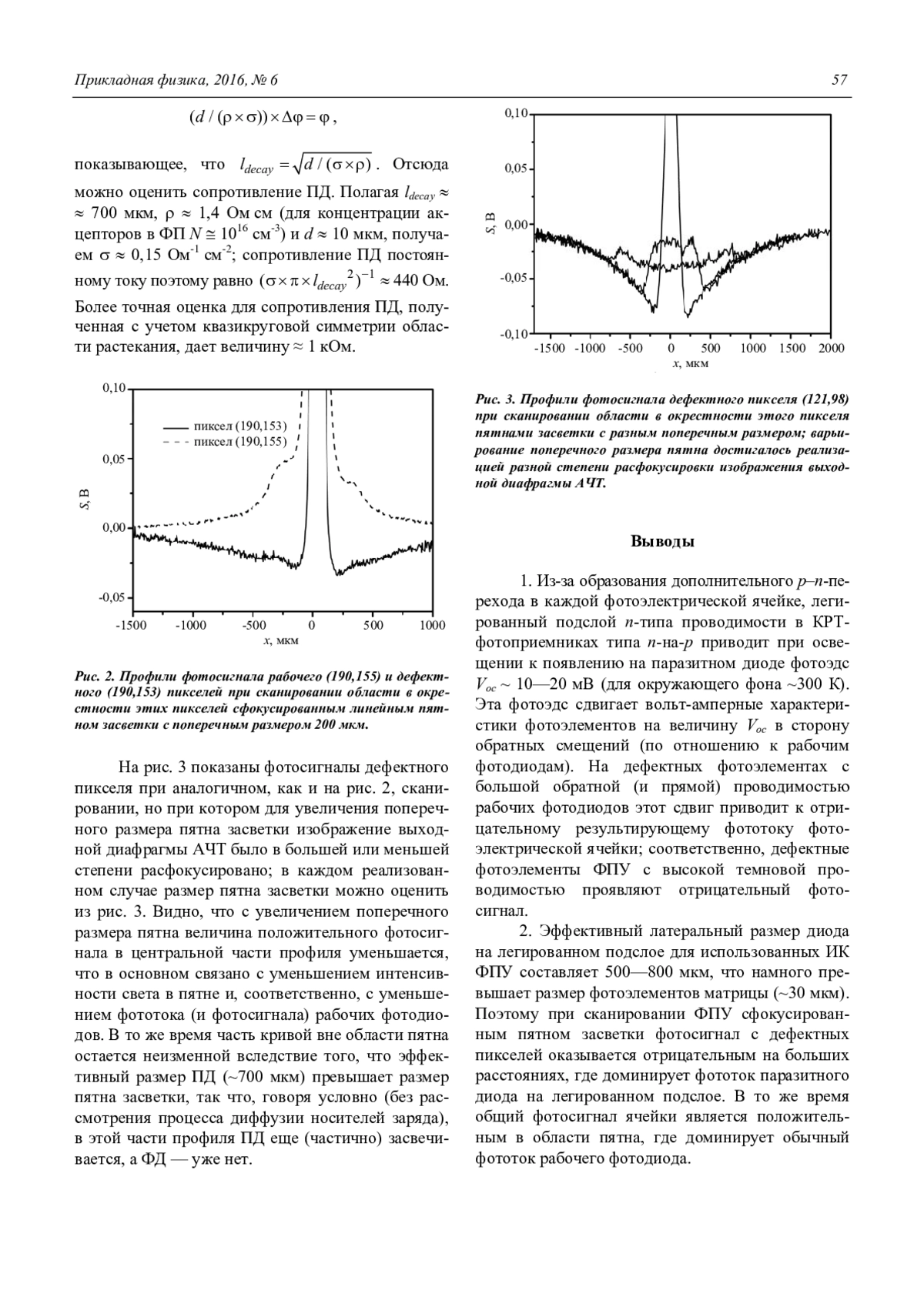 2. Эффективный латеральный размер диода на легированном подслое для использованных ИК ФПУ составляет 500—800 мкм, что намного превышает размер фотоэлементов матрицы (~30 мкм). Поэтому при сканировании ФПУ сфокусированным пятном засветки фотосигнал с дефектных пикселей оказывается отрицательным на больших расстояниях, где доминирует фототок паразитного диода на легированном подслое. В то же время общий фотосигнал ячейки является положительным в области пятна, где доминирует обычный фототок рабочего фотодиода.