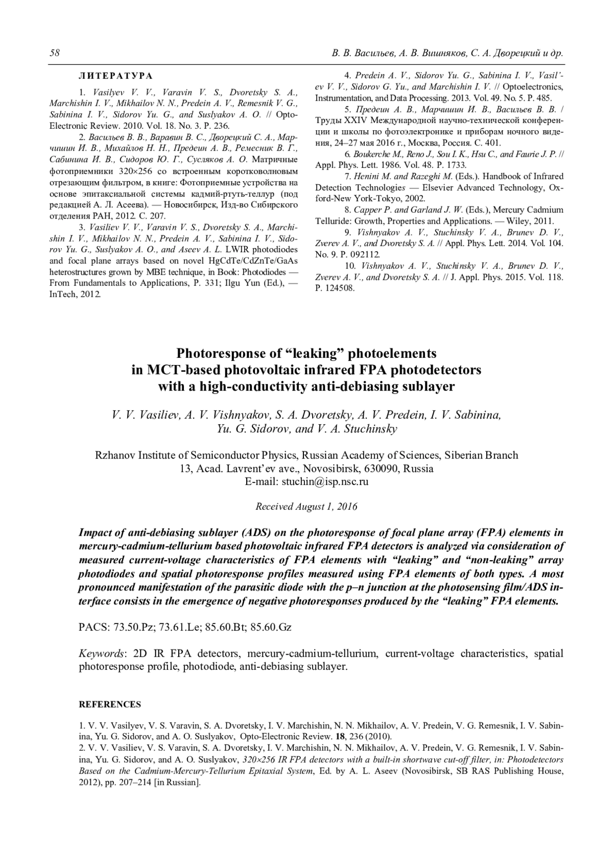 2. V. V. Vasiliev, V. S. Varavin, S. A. Dvoretsky, I. V. Marchishin, N. N. Mikhailov, A. V. Predein, V. G. Remesnik, I. V. Sabinina, Yu. G. Sidorov, and A. O. Suslyakov, 320256 IR FPA detectors with a built-in shortwave cut-off filter, in: Photodetectors Based on the Cadmium-Mercury-Tellurium Epitaxial System, Ed. by A. L. Aseev (Novosibirsk, SB RAS Publishing House,