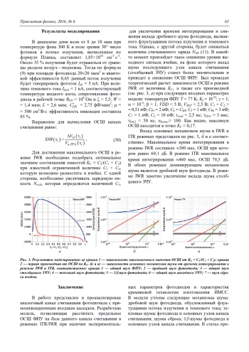 Представлена модель для расчета отношения сигнал/шум КРТ ФПУ на базе канала считывания фотосигнала с прямоинжекционным входным каскадом, работающего в ITR и IWR режимах. Модель позволяет рассчитать и оптимизировать шумовые характеристики ФПУ при наличии экспериментальных параметров фотодиода и характеристик кремниевой технологии изготовления микросхемы считывания. В модели учтены следующие механизмы шума: дробовой шум фотодиода, обусловленный флуктуациями потока излучения и темнового тока; тепловые шумы фотодиода и основных узлов канала считывания; шумы сброса; 1/f-шумы фотодиода и основных узлов канала считывания. Также в модели учитывается эффективность инжекции фототока и влияние паразитных емкостей шин мультиплексирования.