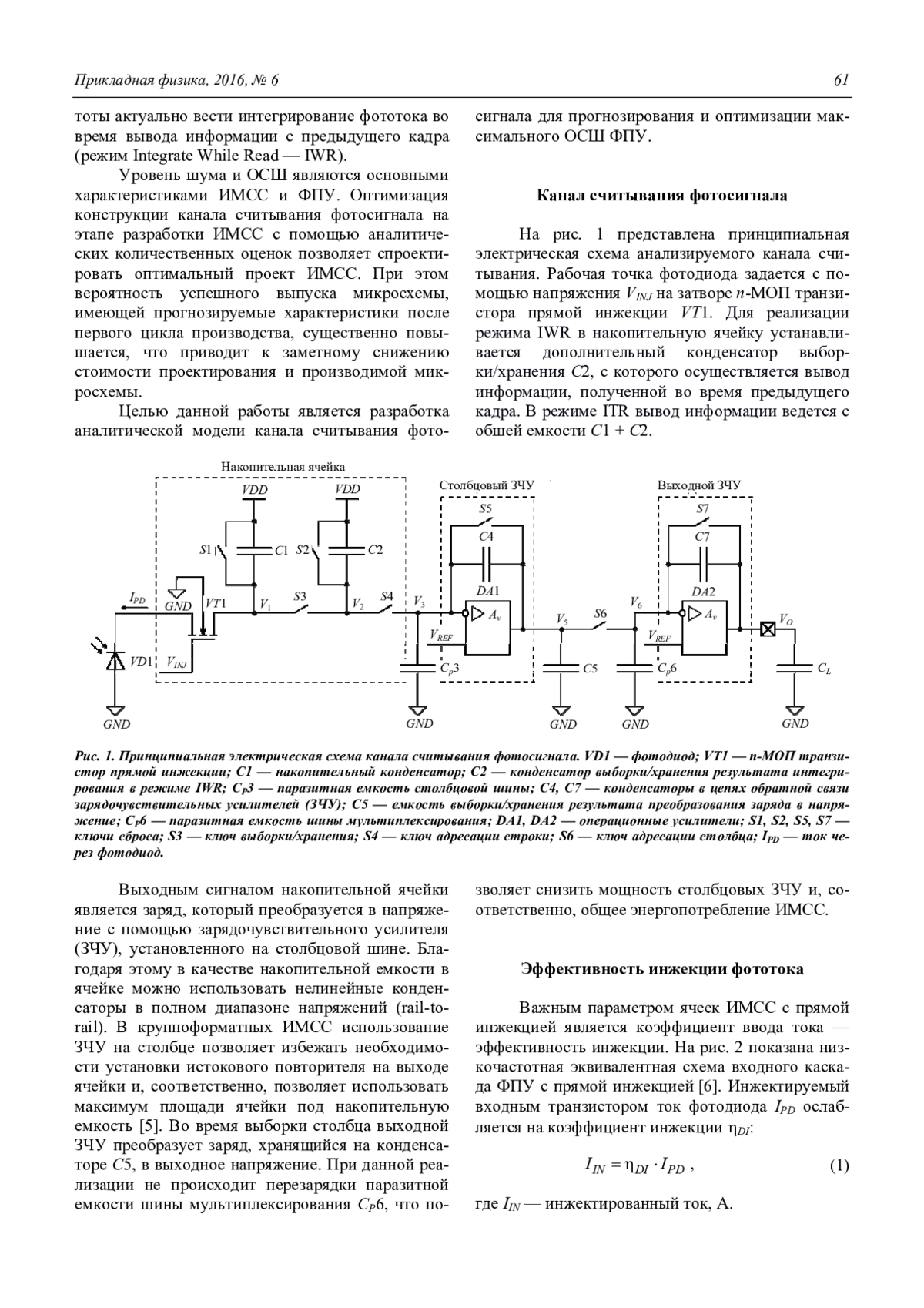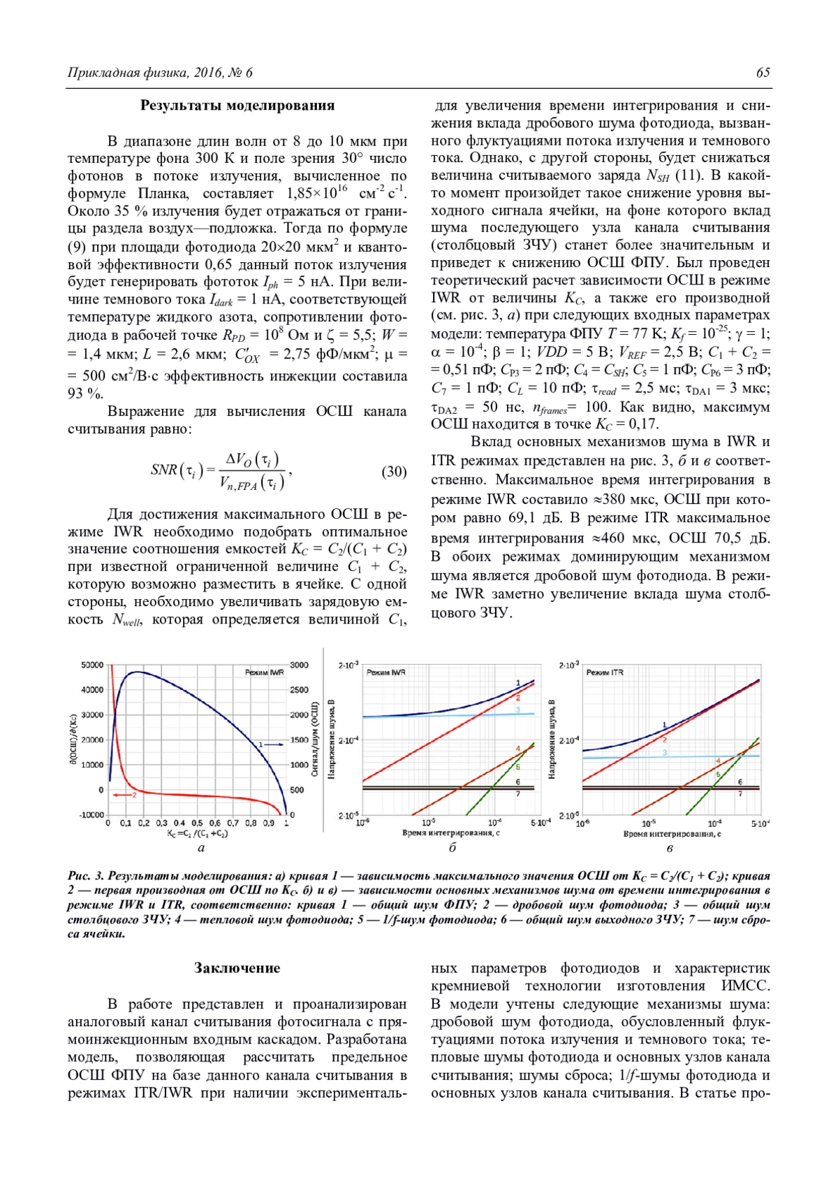 В работе представлен и проанализирован аналоговый канал считывания фотосигнала с прямоинжекционным входным каскадом. Разработана модель, позволяющая рассчитать предельное ОСШ ФПУ на базе данного канала считывания в режимах ITR/IWR при наличии экспериментальных параметров фотодиодов и характеристик кремниевой технологии изготовления ИМСС. В модели учтены следующие механизмы шума: дробовой шум фотодиода, обусловленный флуктуациями потока излучения и темнового тока; тепловые шумы фотодиода и основных узлов канала считывания; шумы сброса; 1/f-шумы фотодиода и основных узлов канала считывания. В статье продемонстрировано применение модели для нахождения оптимальной доли от общей емкости накопительной ячейки, отведенной на емкость выборки/хранения, KC = C2/(C1 + C2) для IWR режима. При фототоке 5 нА, темновом токе фотодиода 1 нА, общей емкости накопительной ячейки С1 + + С2 = 0,51 пФ и рабочем напряжении ИМСС 5 В максимальное ОСШ ФПУ в режиме IWR составило 69,1 дБ при KC = 17 %. В режиме ITR максимальное ОСШ ФПУ составило 70,5 дБ.