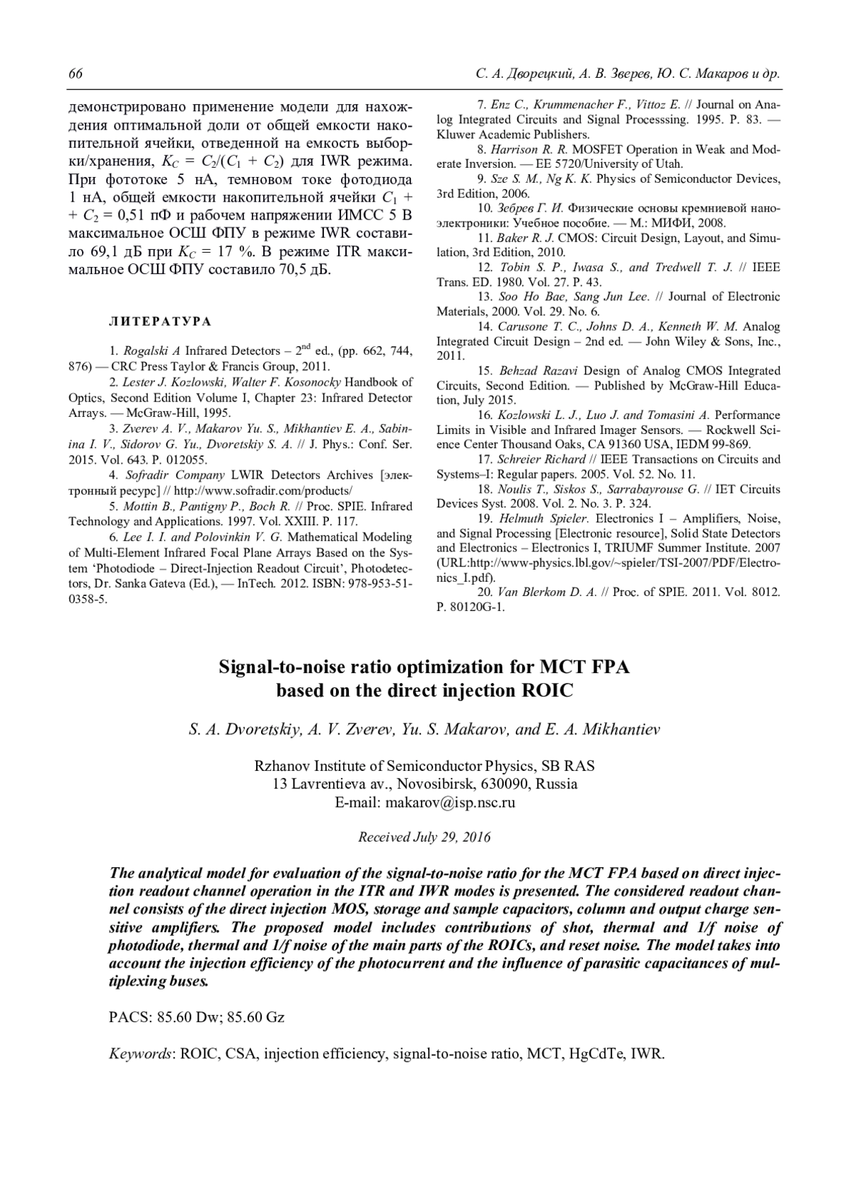 S. A. Dvoretskiy, A. V. Zverev, Yu. S. Makarov, and E. A. Mikhantiev Signal-to-noise ratio optimization for MCT FPA based on the direct injection ROIC 60